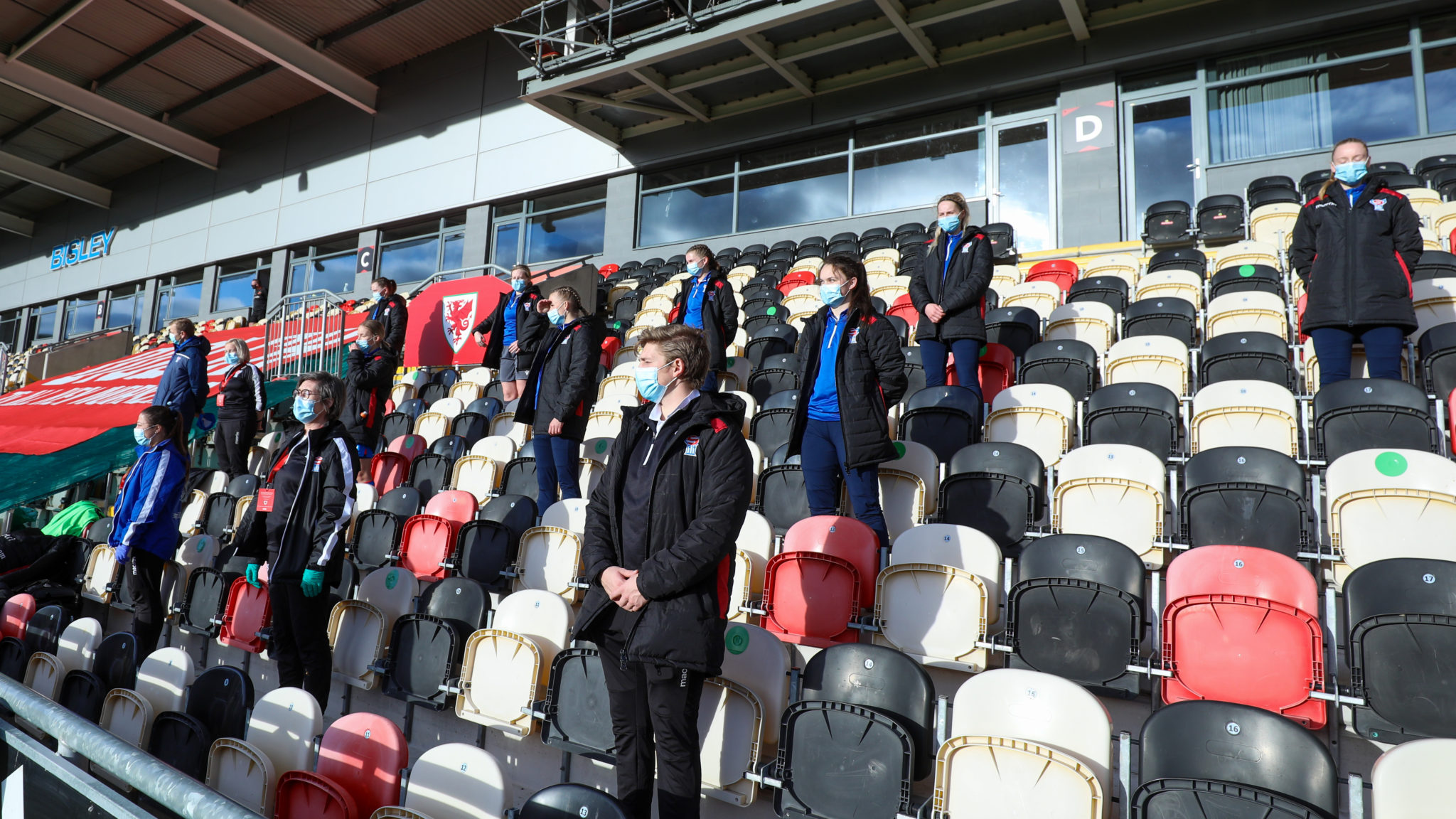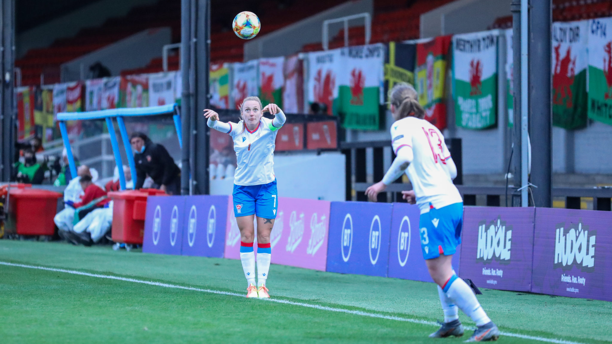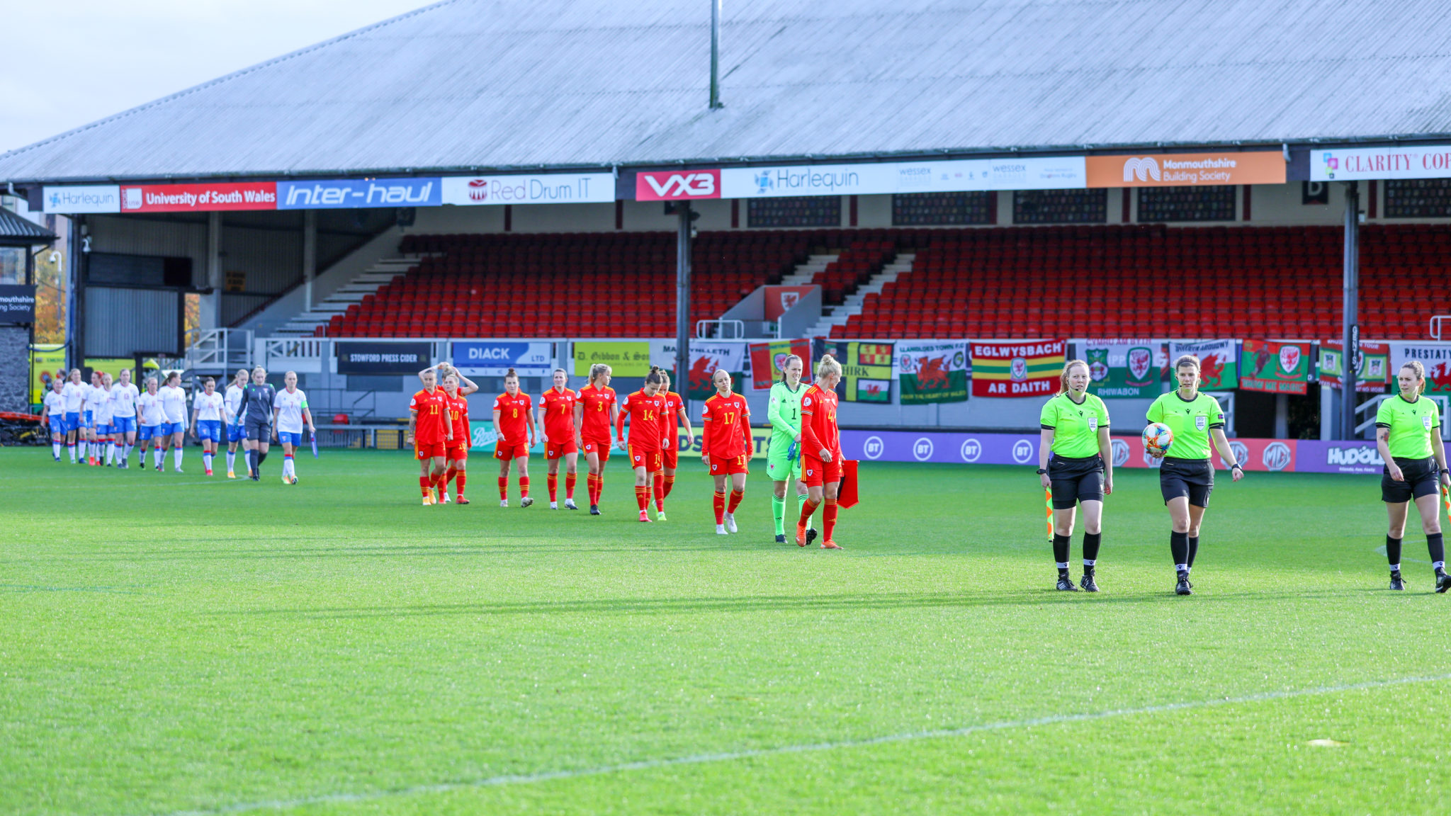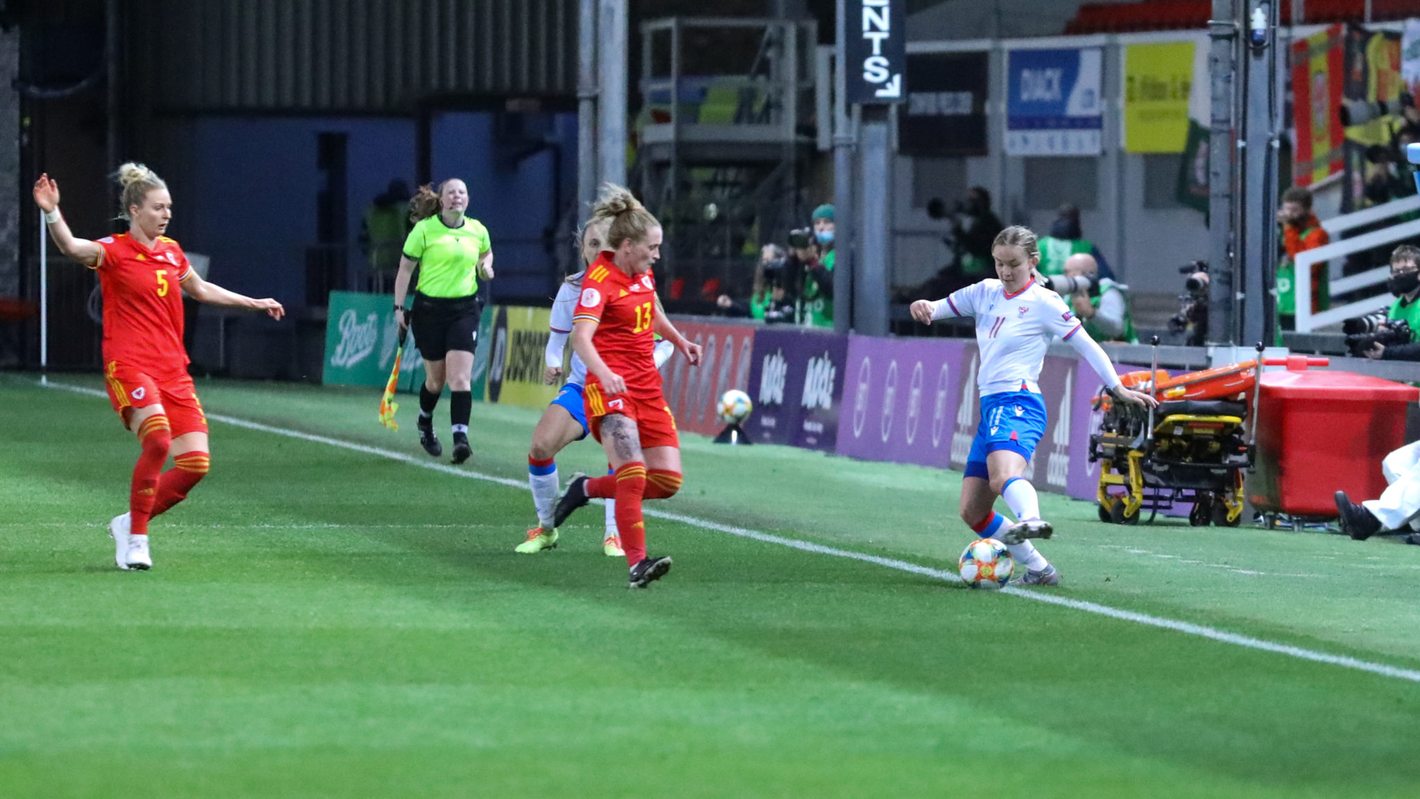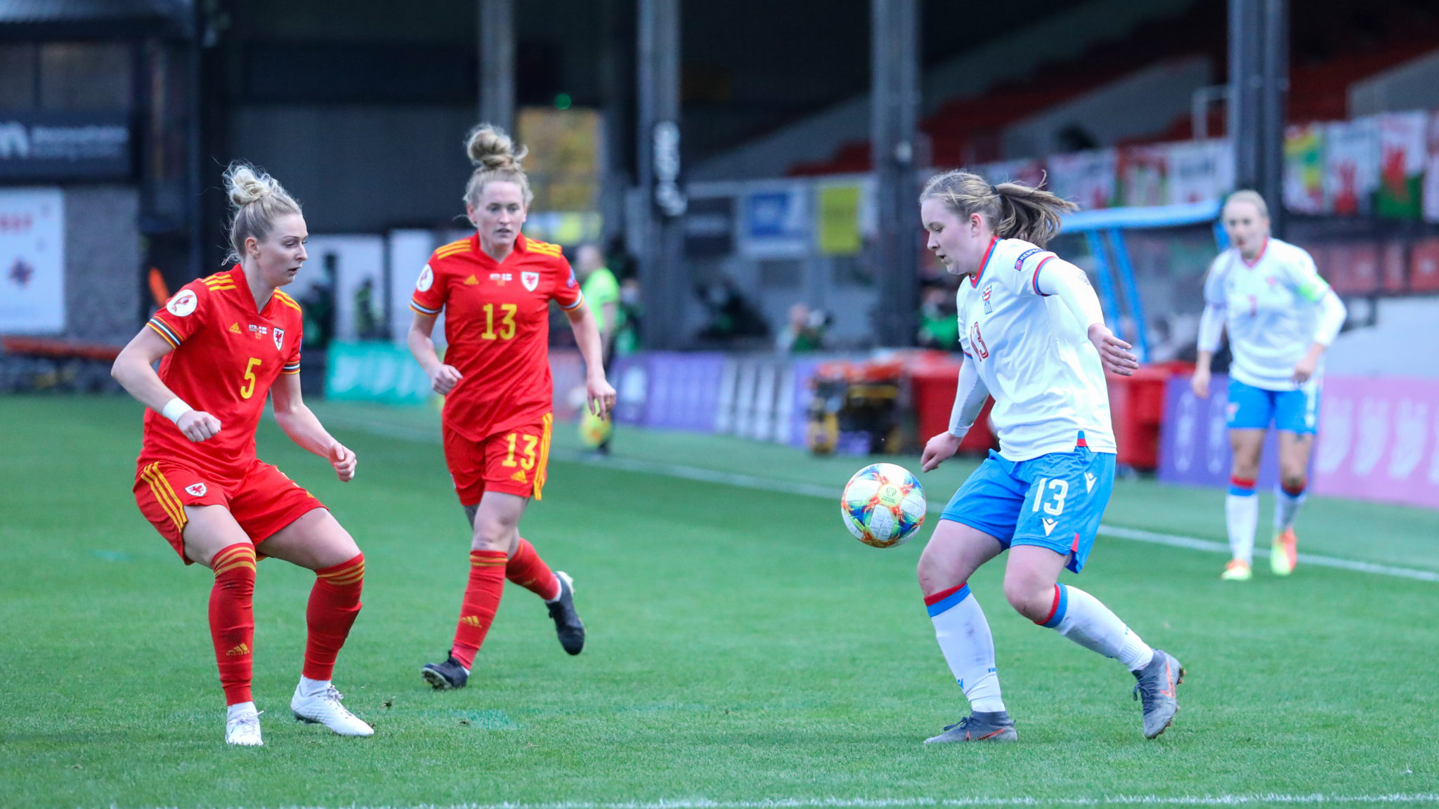 Fyrstu góðu løtuna megnaði føroyska liðið at standa væl ímóti trýstinum, sum javnt og samt var móti brotsteignum, og inni í sjálvum málinum var Óluva Joensen sera vælspælandi við nógvum frálíkum bjargingum. Eftir 33 minuttir fingu walisar hol á málskjótingina, og eittmálsleiðslan helt sær til hálvleiks, hóast heimaliðið tá hevði ligið framvið fleiri ferðir.