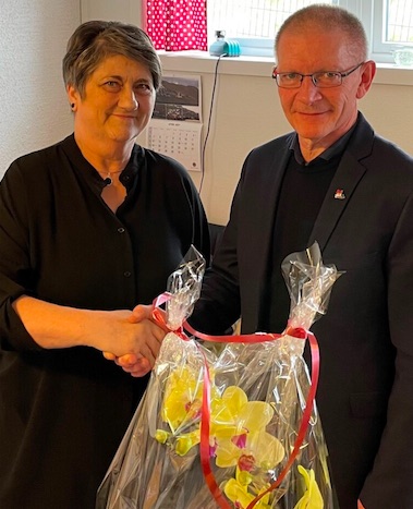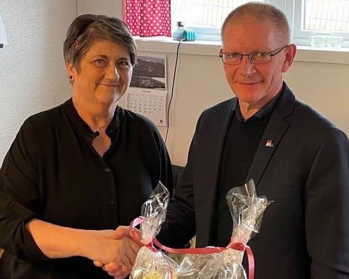 Súni í Hjøllum handaði Katrini Poulsen blómur og takkaði henni vegna kommununa fyri bæði trúgva og drúgva tænastu.