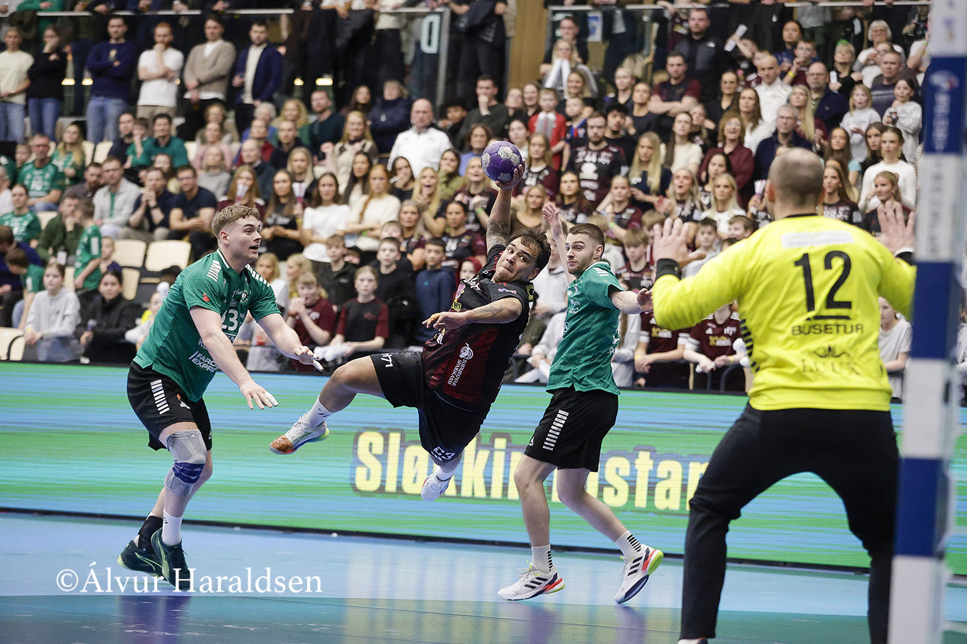 Tað var stórur hvøkkur fyri H71, tá ið álitið í verjuni Peter Krogh longu eftir tríggjar minuttir sá beinleiðis reytt kort. Men tað vísti seg ikki at hava týdning fyri H71 avrikið. Hoyvíkingar vóru frammanfyri 20-14, tá ið tað var hálvleikt, og sum seinni hálvleikur leið, var spurningurin bara, hvussu trivaligur sigurin fór at verða. Helgi Hildarson Hoydal og Rókur Ziskason vóru knassar í miðverjuni