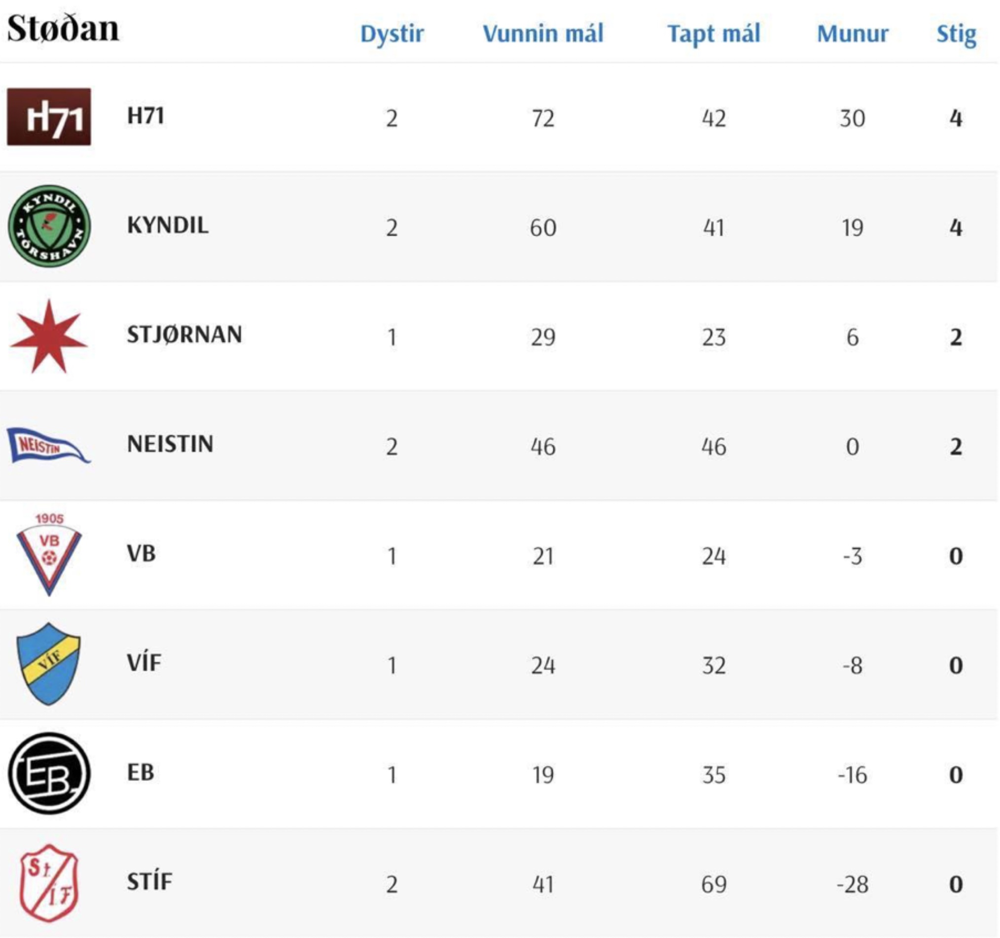 H71 kvinnur eru á odda í SMS-deildini við fýra stigum. Kyndilskvinnur hava somuleiðis fýra stig, men H71 kvinnur hava betri málmun. Her sæst støðan í SMS-deildini: