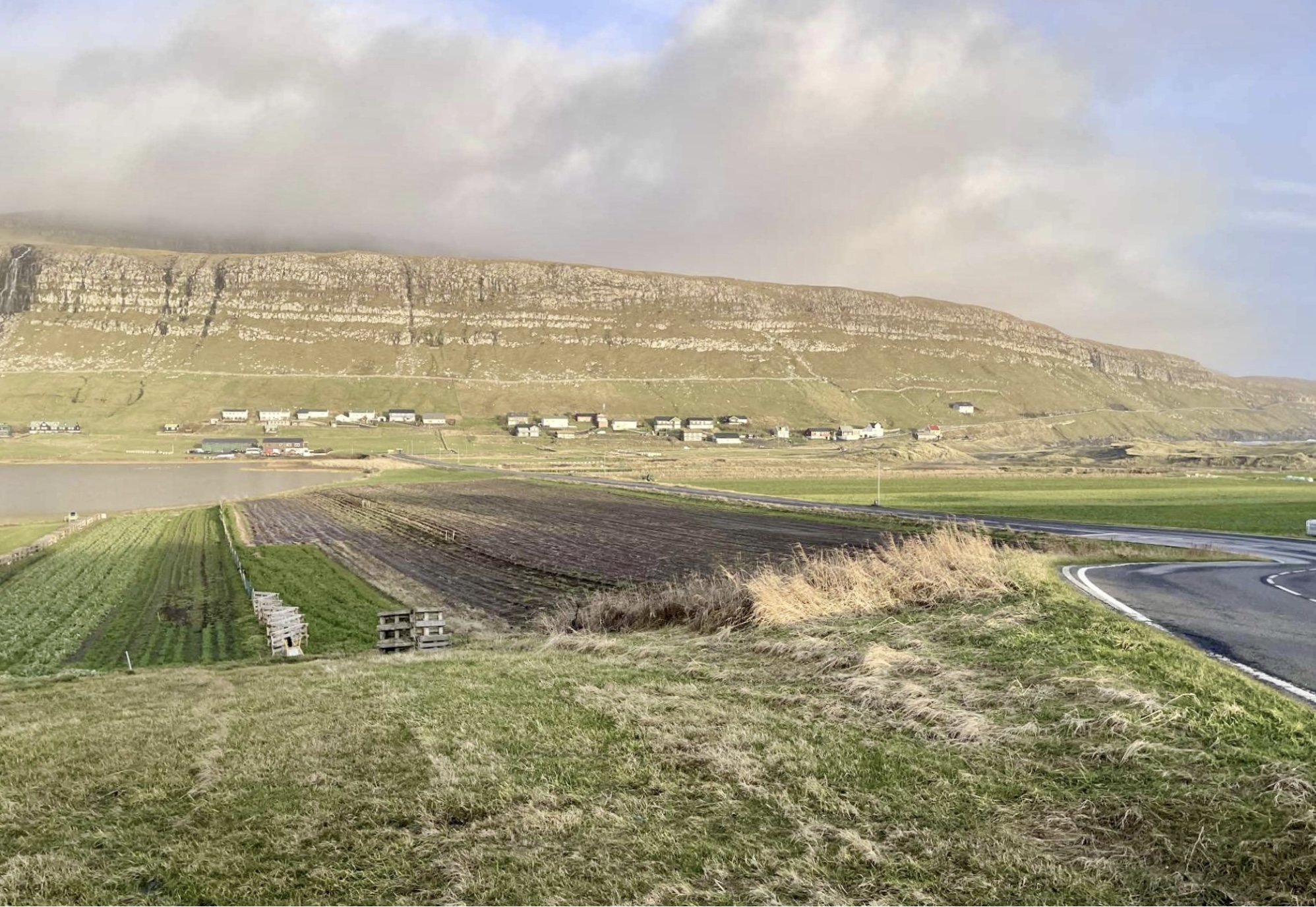 Størstu veltur Føroya á Sandafløttinum – slóðbrótandi grønmetisvinna.  Mølheyggjarnir til høgru – friðaðir. Sandsvatn til vinstru. Skamt frá vatninum skal tvíbreytaður vegur gerast. Yvirfriðingarnevnd skal siga ja eftir lógini. Men verður hon sett til viks í eini verklagslóg?