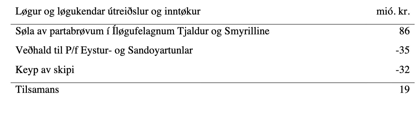 – Samferðslupakkin javnvigar í rakstri og hevur eitt avlop á 19 mió kr. tá ið keyp av fraktferju og veðhald til Eystur-og Sandoyartunlar eru trektar frá søluni av eigaraluti landsins í feløgunum Tjaldur og Smyril Line.