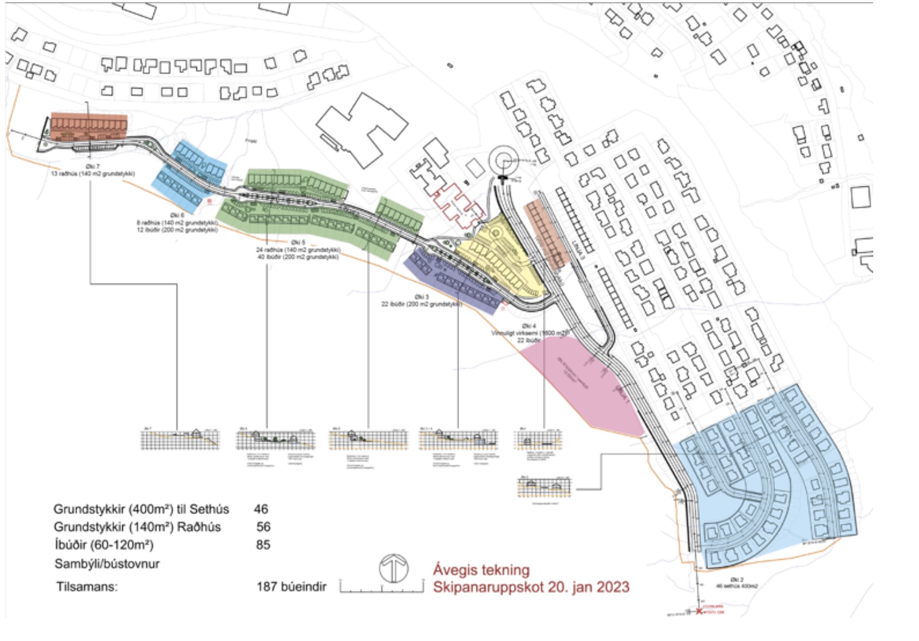 Talan er um blandaða bygging, har eitt øki er lagt av til ymiskt tænastuvirksemi við 22 íbúðum í ovaru hæddunum, umframt 82 raðhús – har 37 raðhús eisini kunnu innrættast við tveimum íbúðum. Harumframt verður grundstykki til eini 46 sethús.