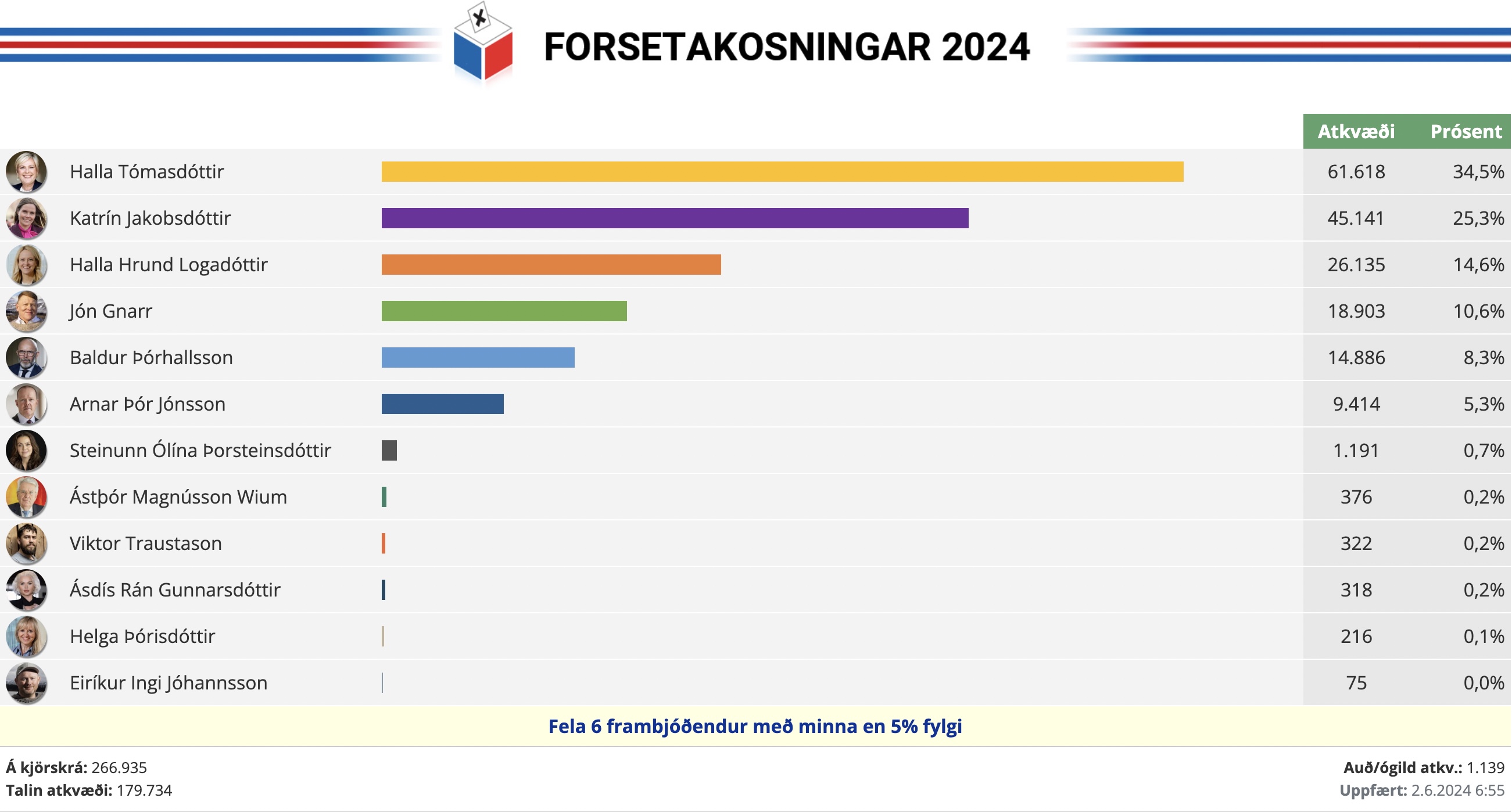 Við 34,5 prosetnum av atkvøðunum vann Halla Tómasdóttir í gjár forsetavalið í Íslandi. Hon vann soleiðis á fyrrverandi forsætisráðfrúnni Katrin Jakobsdóttir, sum legði frá sær sum forsætisráðfrú fyri at stilla upp til forsetavalið. Men tað miseydnaðist henni.
