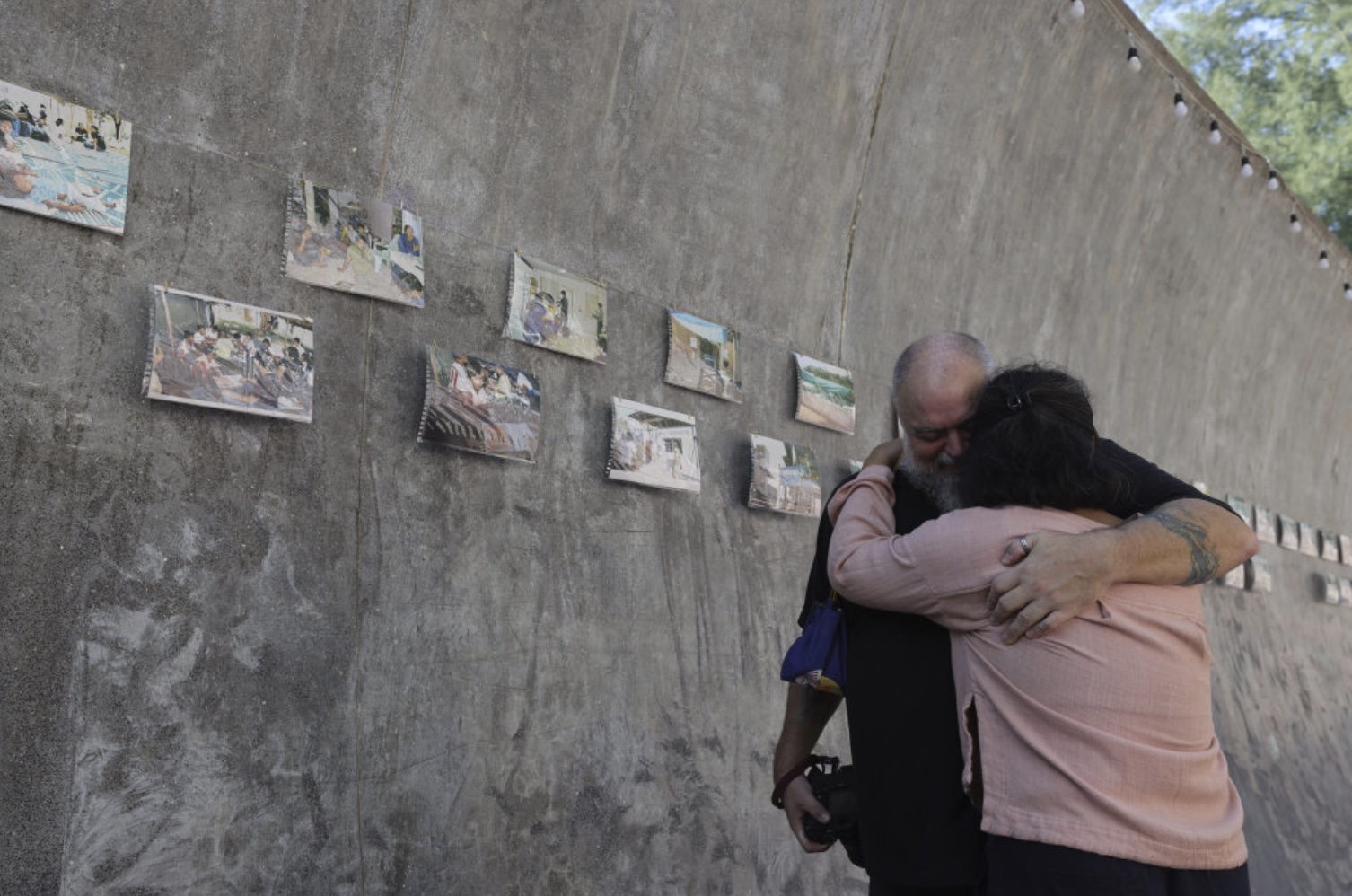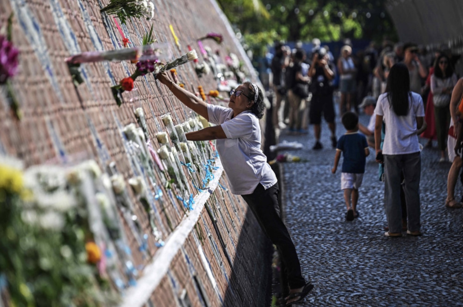 Í Ban Nam Khem lgdu avvarðandi við tárum í eygum blómur og kransar við bygdaminnisvarðan í morgun lokala tíð: ein bogaður veggur í sama formi sum ein tsunami-alda við nøvnunum á ofrunum á.