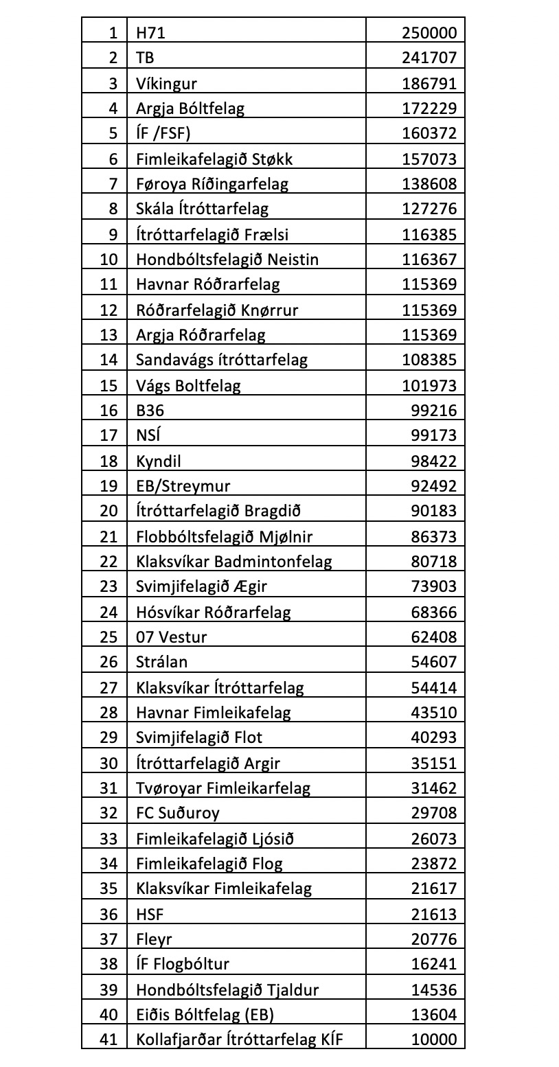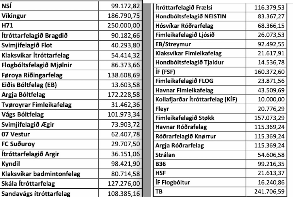 ÍSF sigur, at upprunaliga søktu 49 felagsskapir um 5,7 milliónir krónur tilsamans, men eftir reglugerðini høvdu øll ikki rætt til at fáa stuðul. Fyri ítróttin var úrslitið, at 41 ítróttarfelag fingu tilsamans 3,5 milliónir í stuðuli.