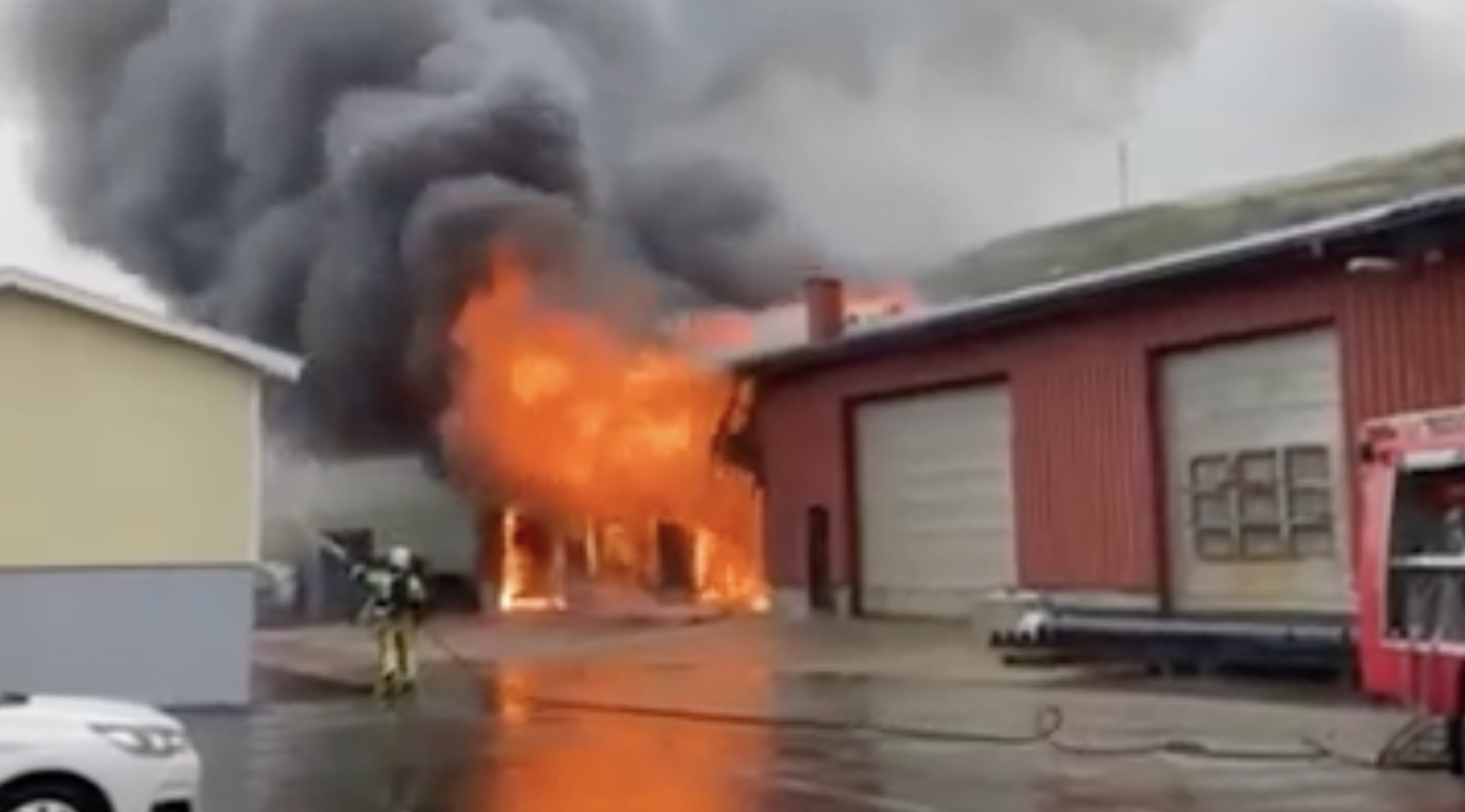 Tað var klokkan 17.33 í gjár at ringt varð til løgregluna at boða frá, at eldur var í vinnubygninginum hjá KJ-Sandblásing við Ljósá. Vandi var fyri vandamiklum royki og tí varð landsvegurin ímillum Ljósá og Eiði, stongdur.