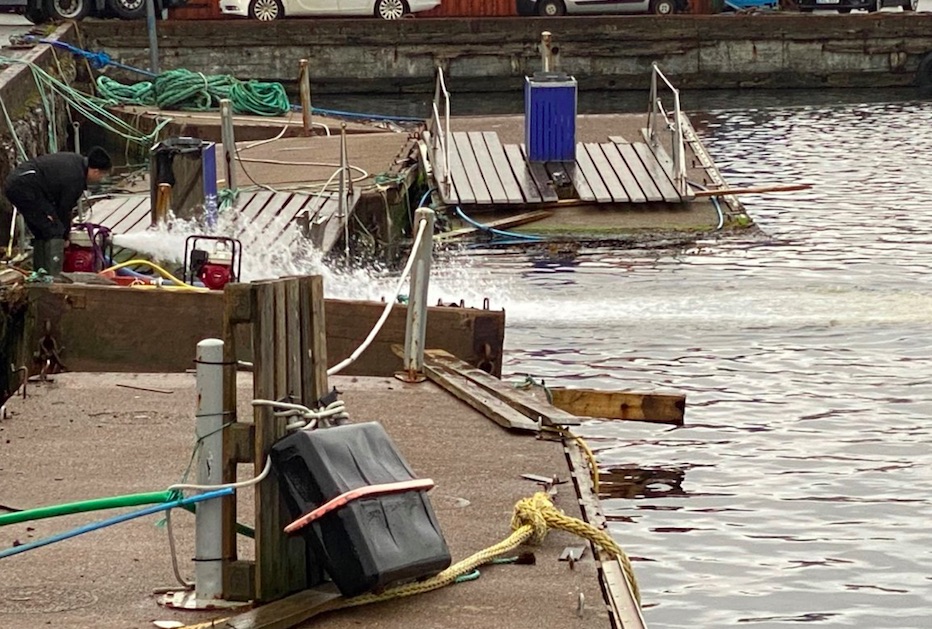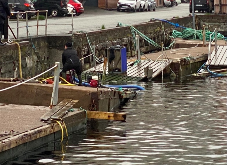 Í morgun varð farið í holt við at tøma bátabrúgvarnar, sum hava ligið norðan fyri heimaru bryggju í Klaksvík. Brúgvarnar eru gjørdar úr betongi og eru opnar innan, so neyðugt er at tøma tær eftir tørvi.