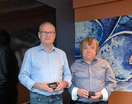 Tað var formaður felagsins, Jan Højgaard, sum handaði heiðursgávurnar til teir báðar. Teir fingu handað hvør sítt lummaur í sambandi við, at teir nú gevast í teirra yrki á sjónum. Teir hava siglt í ávikavist 50 og 57 ár.