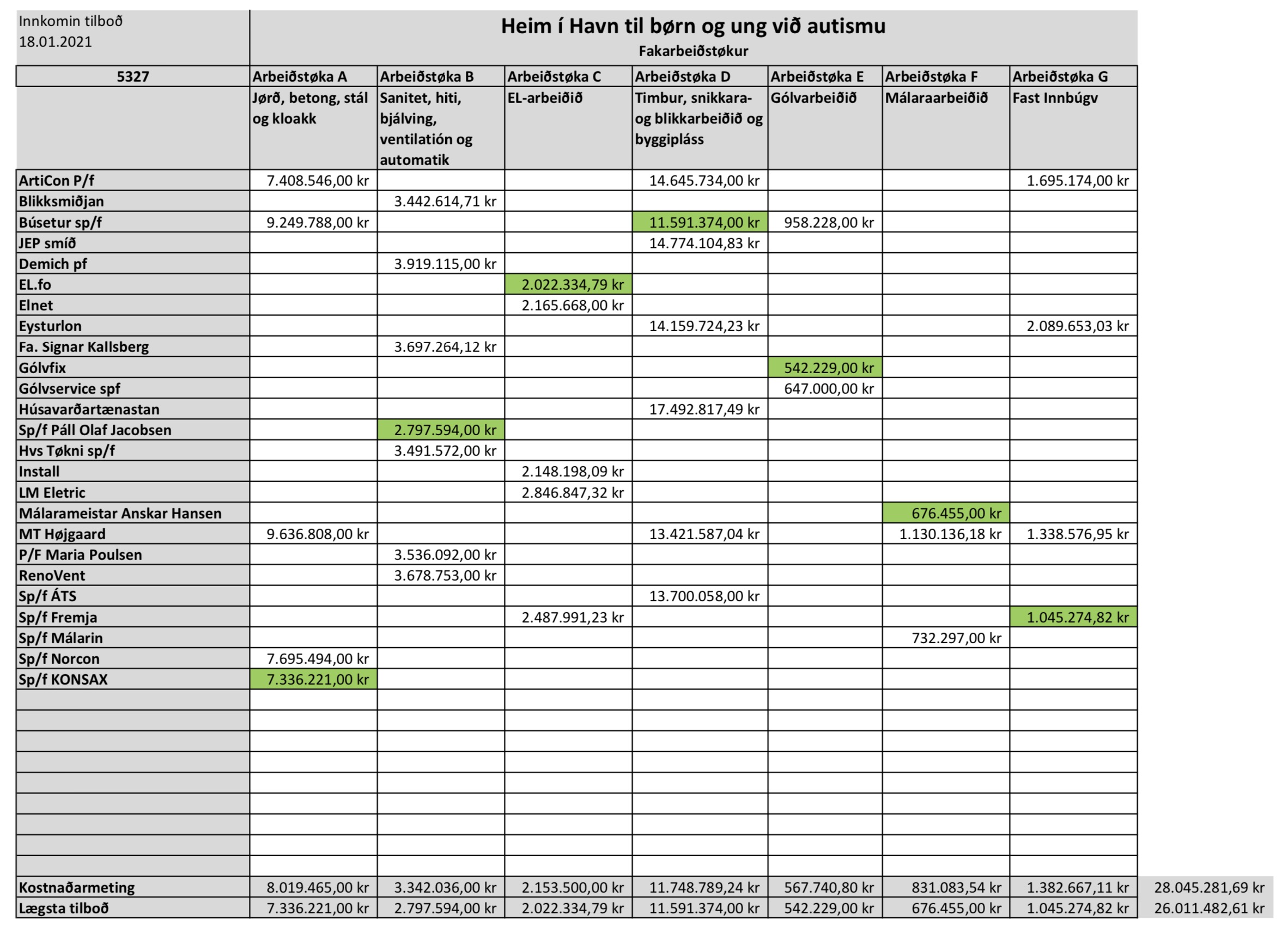 Tilboðini at byggja heimið til børn og ung við autismu, sum skal byggjast í Kvíggjartún á Argjum, vóru í dag latin upp. Samanlangt vóru tilboðini lægri enn kostnaðarmetingin, og samanlagt fer tað at kosta 39 mió. kr. at byggja heimið.