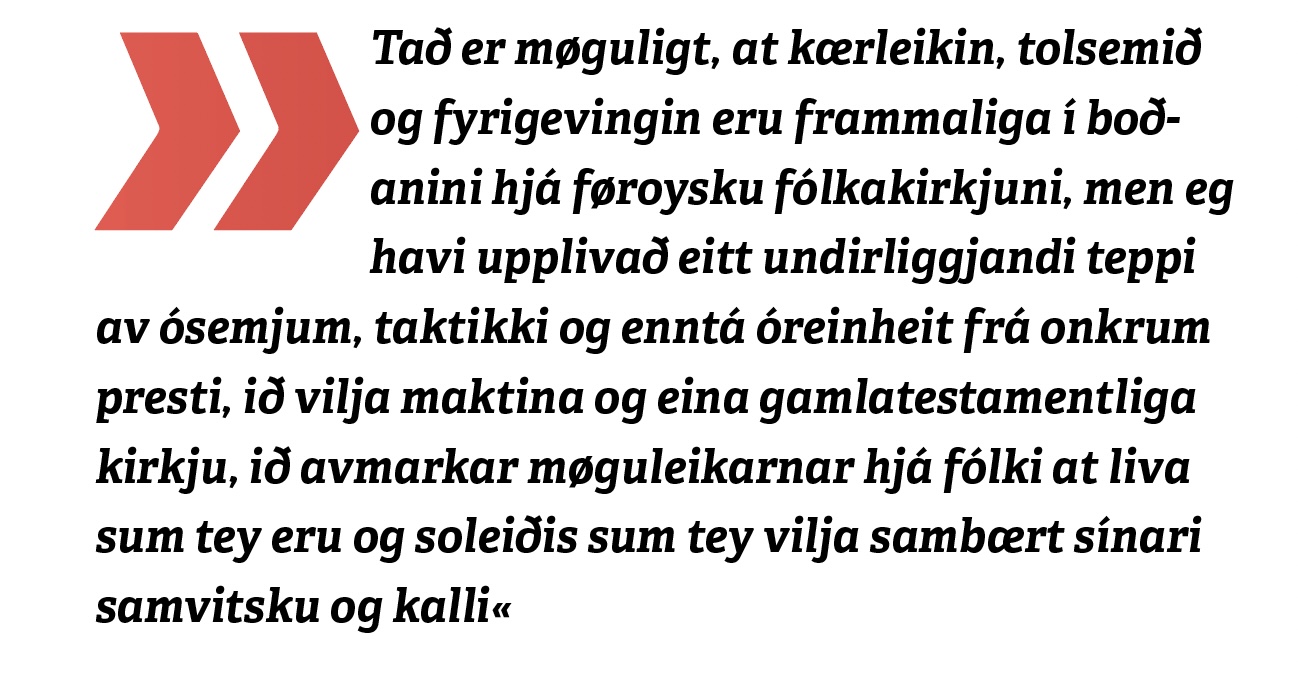 Tað er møguligt, at kærleikin, tolsemið og fyrigevingin eru frammaliga í boðanini hjá føroysku fólkakirkjuni, men eg havi upplivað eitt undirliggjandi teppi av ósemjum, taktikki og enntá óreinheit frá onkrum presti, ið vilja maktina og eina gamlatestamentliga kirkju, ið avmarkar møguleikarnar hjá fólki at liva sum tey eru og soleiðis sum tey vilja sambært sínari samvitsku og kalli.