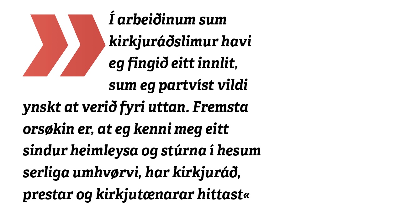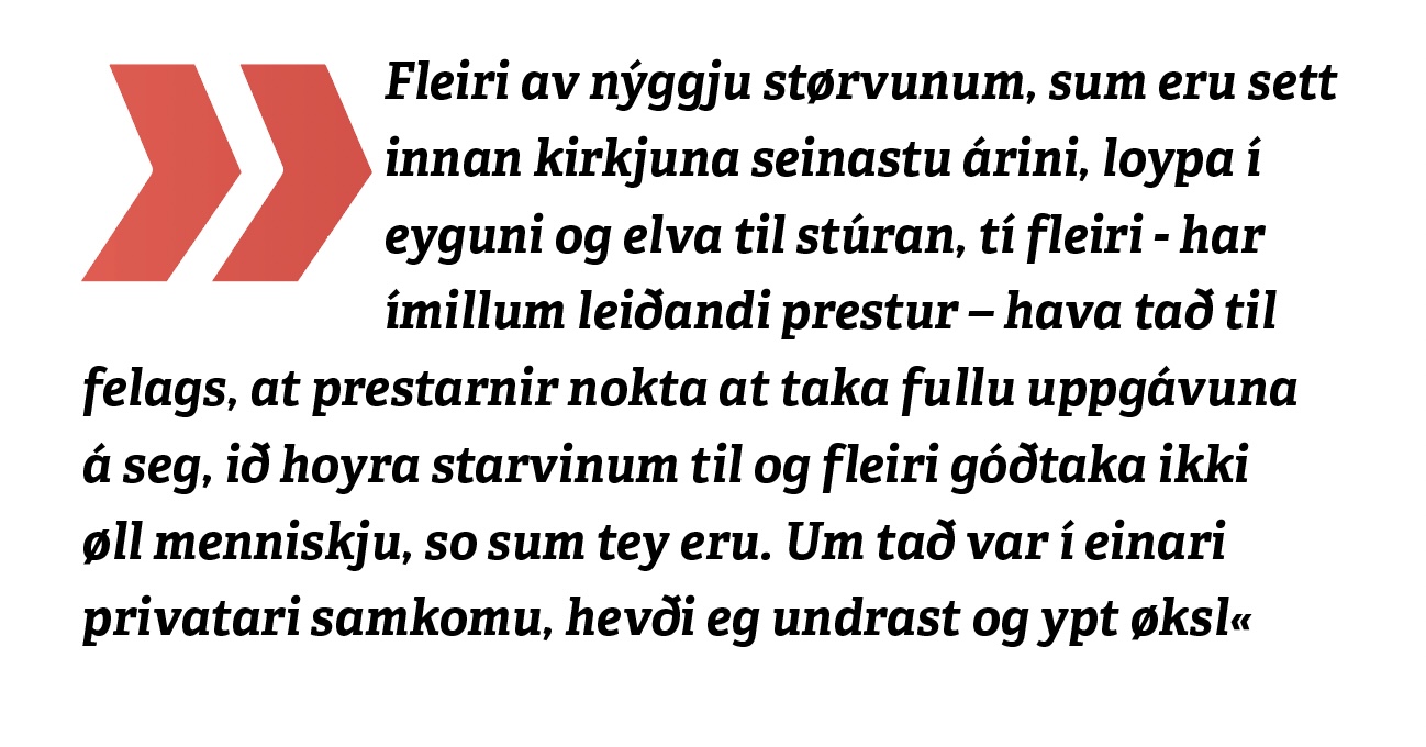 Fleiri av nýggju størvunum, sum eru sett innan kirkjuna seinastu árini, loypa í eyguni og elva til stúran, tí fleiri - har ímillum leiðandi prestur – hava tað til felags, at prestarnir nokta at taka fullu uppgávuna á seg, ið hoyra starvinum til og fleiri góðtaka ikki øll menniskju, so sum tey eru. Um tað var í einari privatari samkomu, hevði eg undrast og ypt øksl. Hvør skal siga: tað mugu tey um.