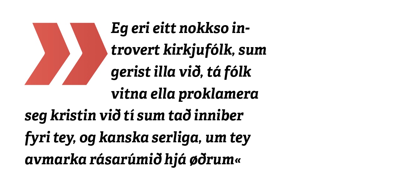 Eg eri eitt nokkso introvert kirkjufólk, sum gerist illa við, tá fólk vitna ella proklamera seg kristin við tí sum tað inniber fyri tey, og kanska serliga, um tey avmarka rásarúmið hjá øðrum.