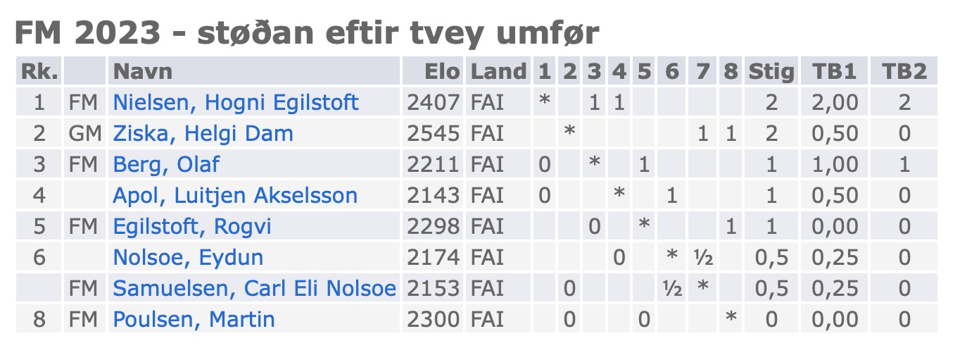 Rógvi Egilstoft tapti sunnukvøldið fyri Olaf Berg. Teir fóru ikki undir talvið fyrr enn um nátturðatíð, tí Rógvi var upptikin av fótbólti fyrr á degi. Tað gjørdist sum væntandi var eitt rokmikið talv. Í ógreiðari støðu offraði Rógvi mann, kanska hevði hann forroknað seg, tí einki spurdist burturúr riddaraoffrinum, og Olaf vann lættliga eftir tað. Møguliga er tað í so harður kostur fyrst at spæla fótbólt móti KÍ og so til Havnar at telva móti sterkum mótstøðumanni.