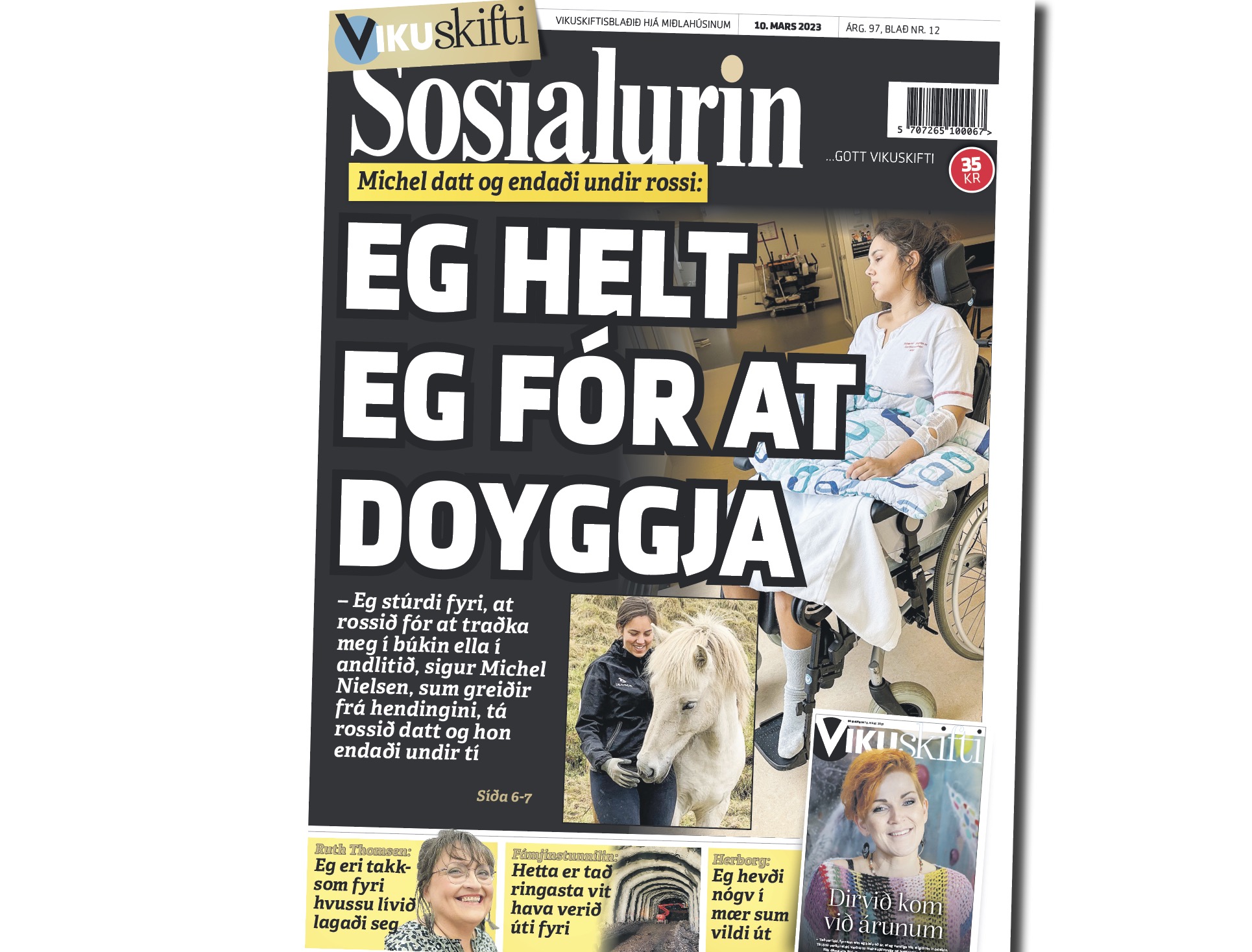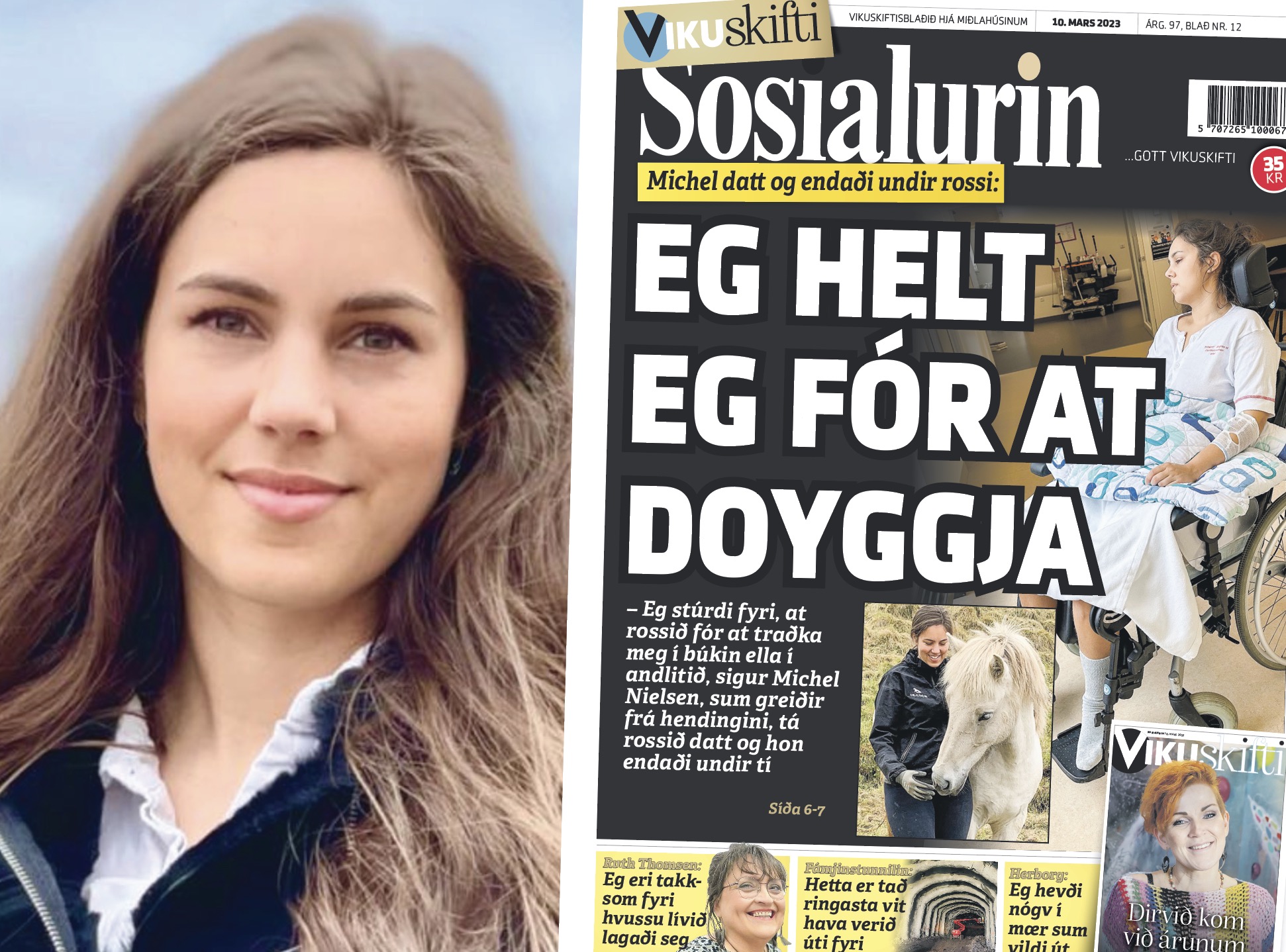 Sosialurin: – Eg stúrdi fyri, at rossið fór at traðka meg í andlitið ella í búkin, tá tað royndi at sleppa á føtur aftur. Hendi tað, hevði eg helst doyð, sigur Michel Nielsen í samrøðu við Sosialin. Hon greiðir frá ógvusligu hendingini, tá rossið, hon reið á – sum vigar millum 800 og 900 pund – datt framav, og hon kom at liggja undir og breyt kokubeinið í trimum støðum.