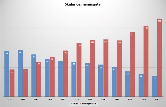 Talið á skúlum í Føroyum er minkað við eini helvt seinastu 60 árini, úr 94 skúlum í 1955 niður í 43 skúlar í 2015. Tað skrivar Skúlablaðið. Sama tíðarskeið er samlaða næmingatalið trífaldað.