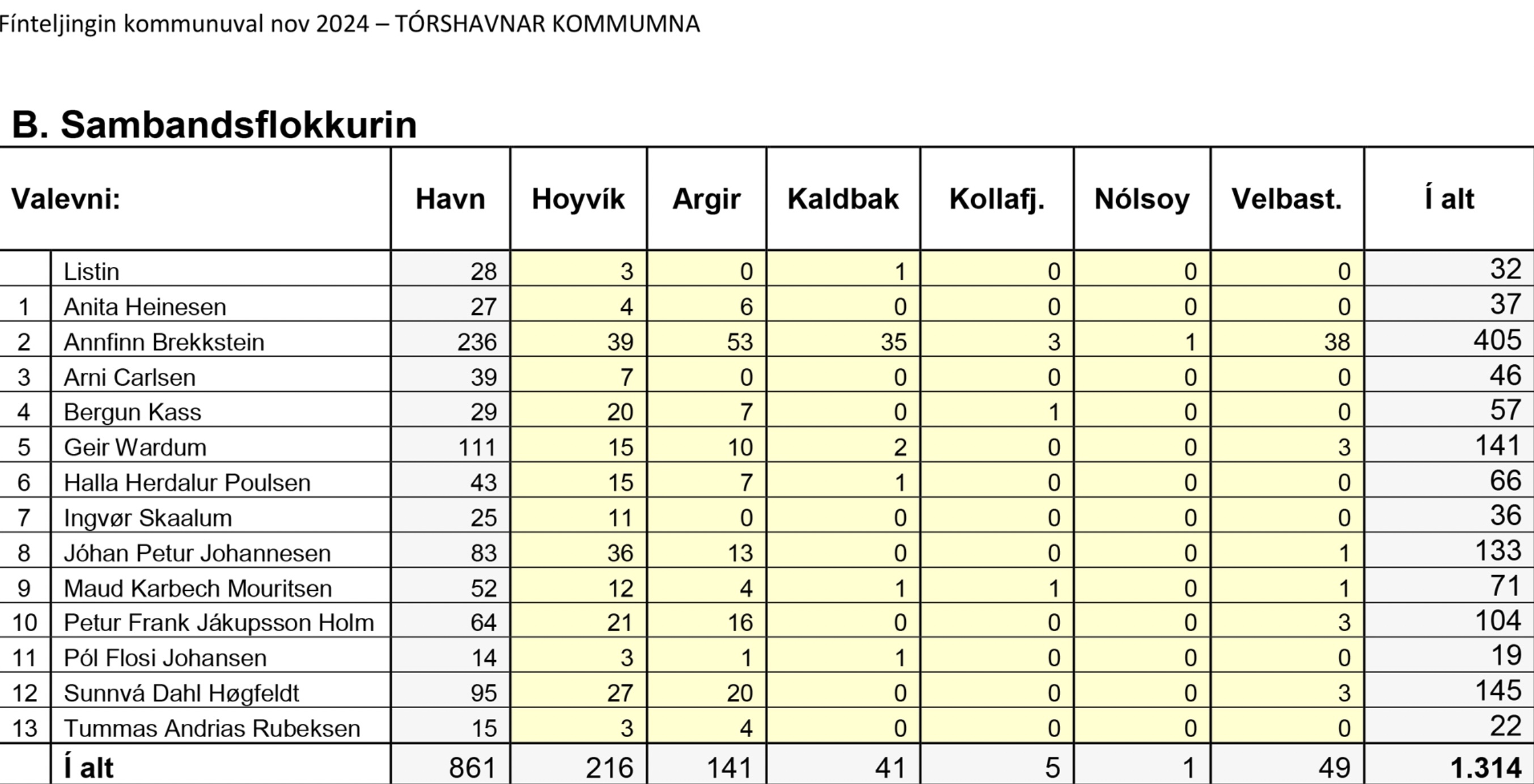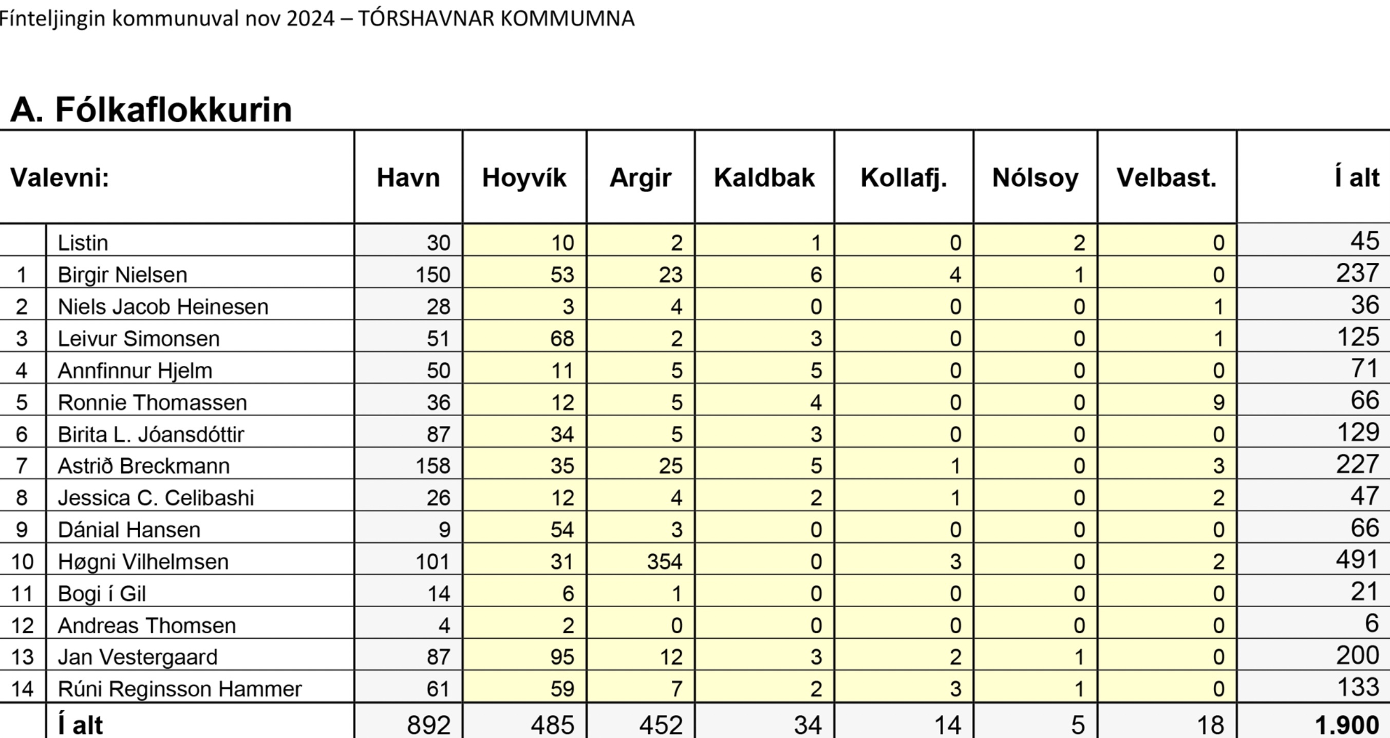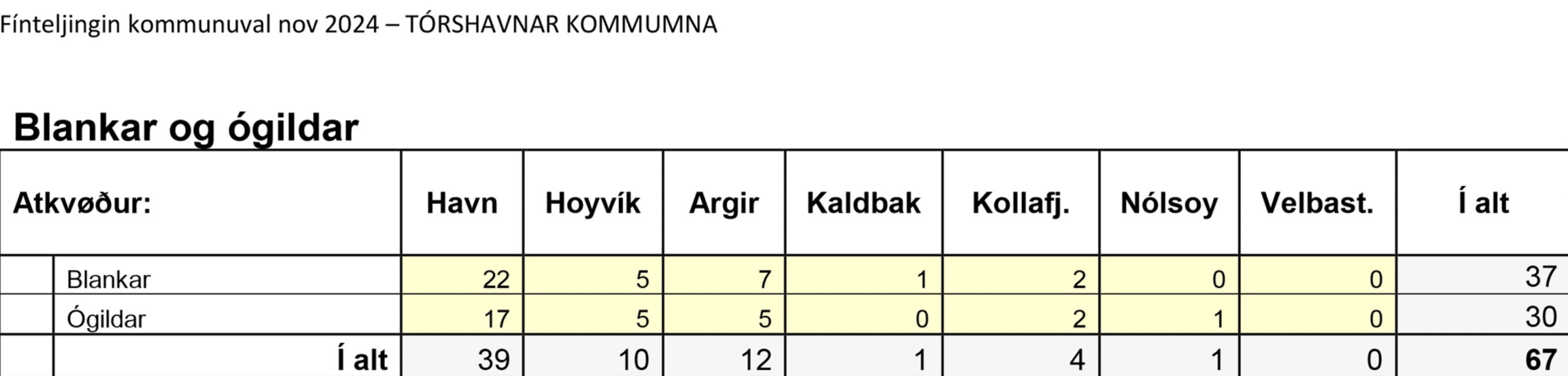 Niðanfyri sæst endaliga býtið av atkvøðunum millum flokkar og valevni, umframt talið av blonkum og ógildigum atkvøðum.