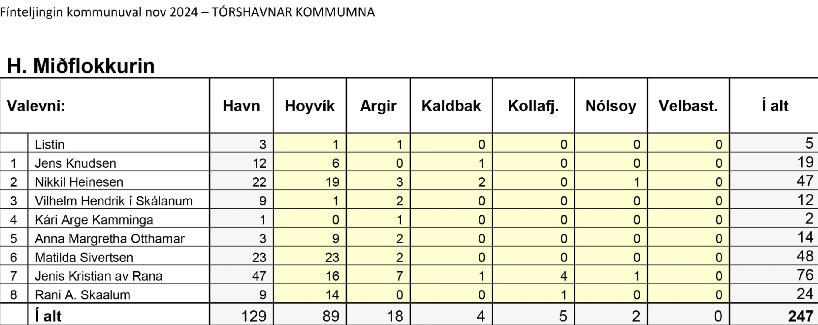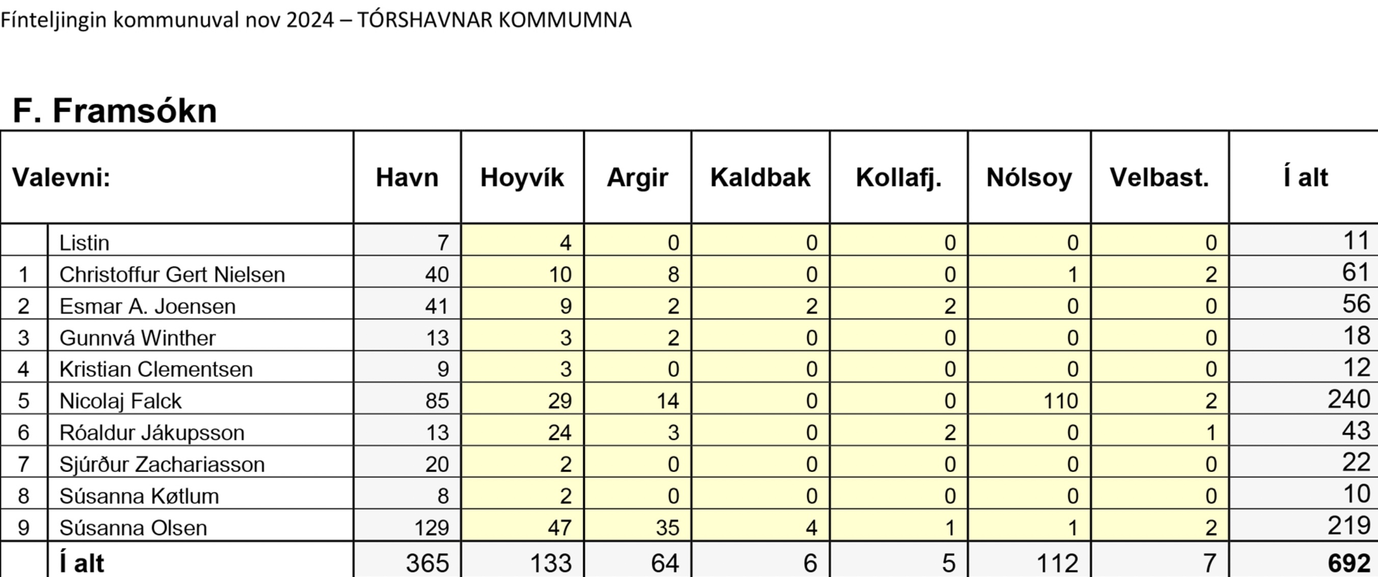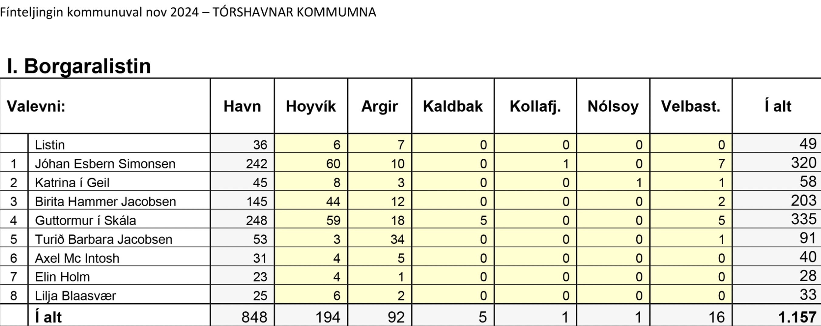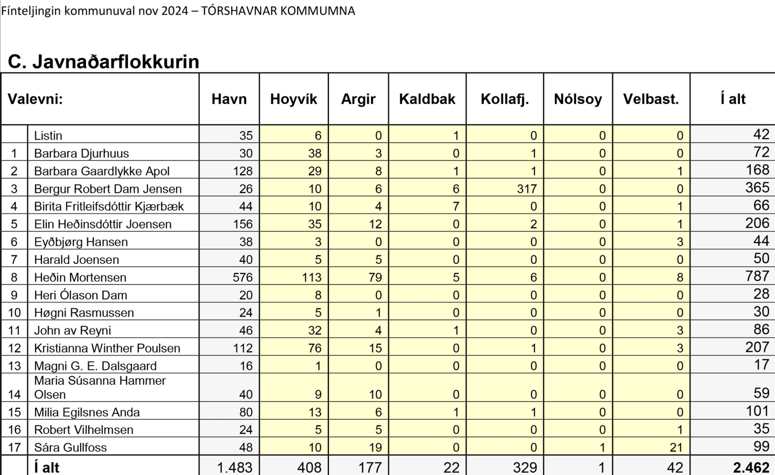 Niðanfyri sæst endaliga býtið av atkvøðunum millum flokkar og valevni, umframt talið av blonkum og ógildigum atkvøðum.