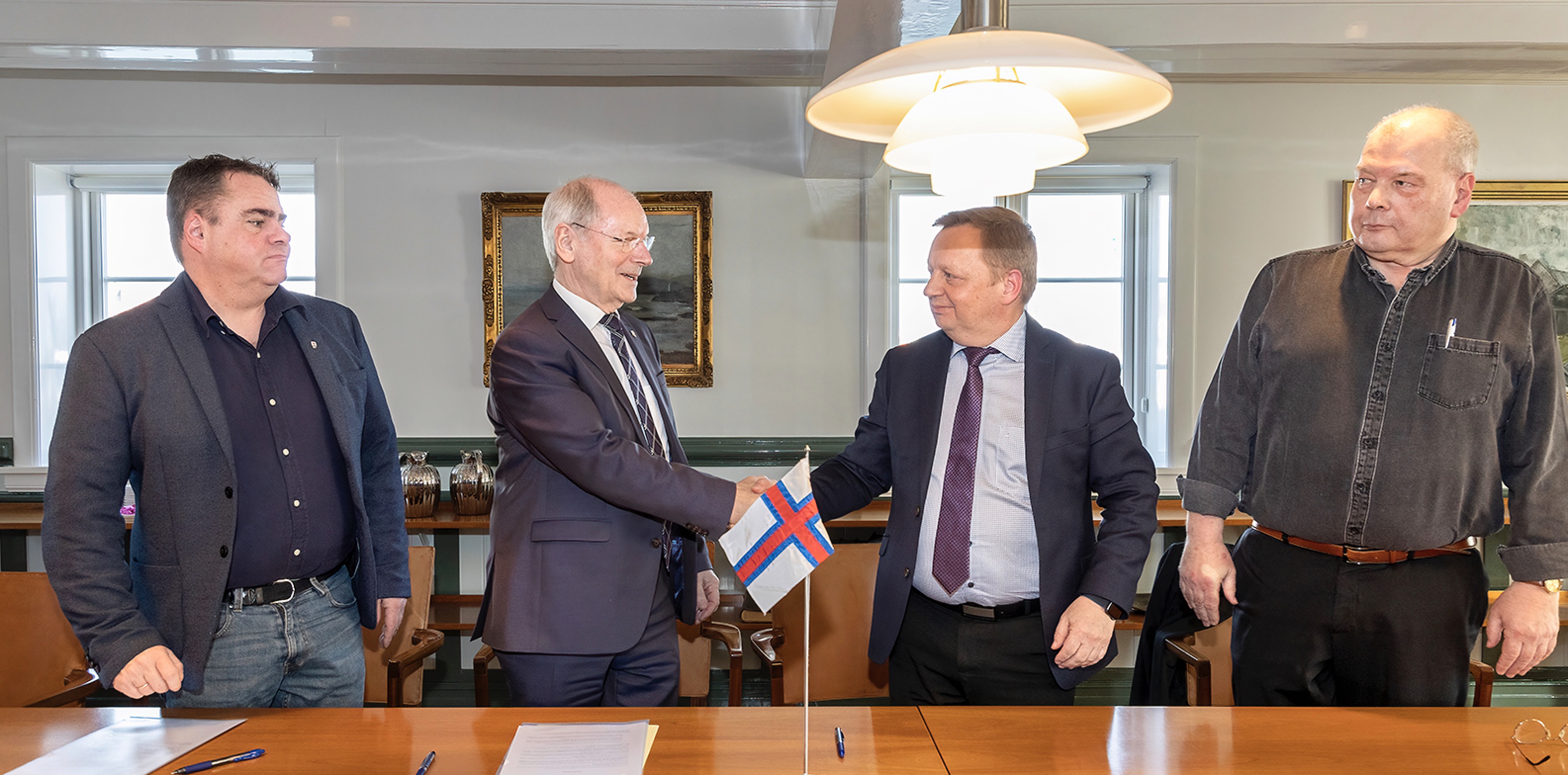 Magnus Rasmussen, landsstýrismaður, skrivaði undir fyri Føroya landsstýrið og Heðin Mortensen, Tórbjørn Jacobsen og Kári Johansen skrivaðu undir umboðandi eina samráðingarnevnd - vald á eykaaðalfundi hjá SEV hin 26. november 2021.