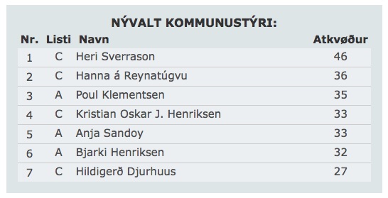 Á lista C varð Heri Sverrason fyrst valdur við 46 atkvøðum, og vit kunnu leggja aftrat, at hann eisini varð fyrst valdur á sínum lista á kommunuvalinum í 2016. Men, tá fekk listin ikki borgarstjóran.