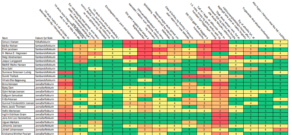 Spurningarnir snúgva seg allir um umhvørvis- og náttúrumál, og hesar fingu løgtingsvalevnini høvi at svara síðst í juli. Hvør spurningur skuldi svarast við at velja eitt tal millum 1 og 5, sum vísir, hvussu samdur ella ósamdur mann er við hvørjari útsøgn. 1 er sera ósamd/ur, meðan 5 er sera samd/ur.