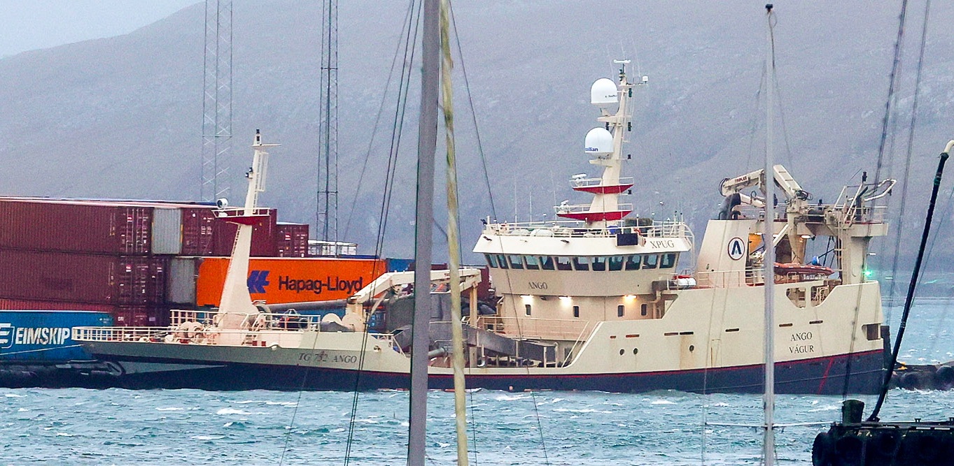 Uppsjóvarskipið Ango liggur við Havnarmola og bíðar eftir landingartørni á Havsbrún í Fuglafirði. Teir hava millum 1300 og 1400 tons av svartkjafti, sum teir fingu í trý samdøgur á einari leið eystur av Munkagrunninum.