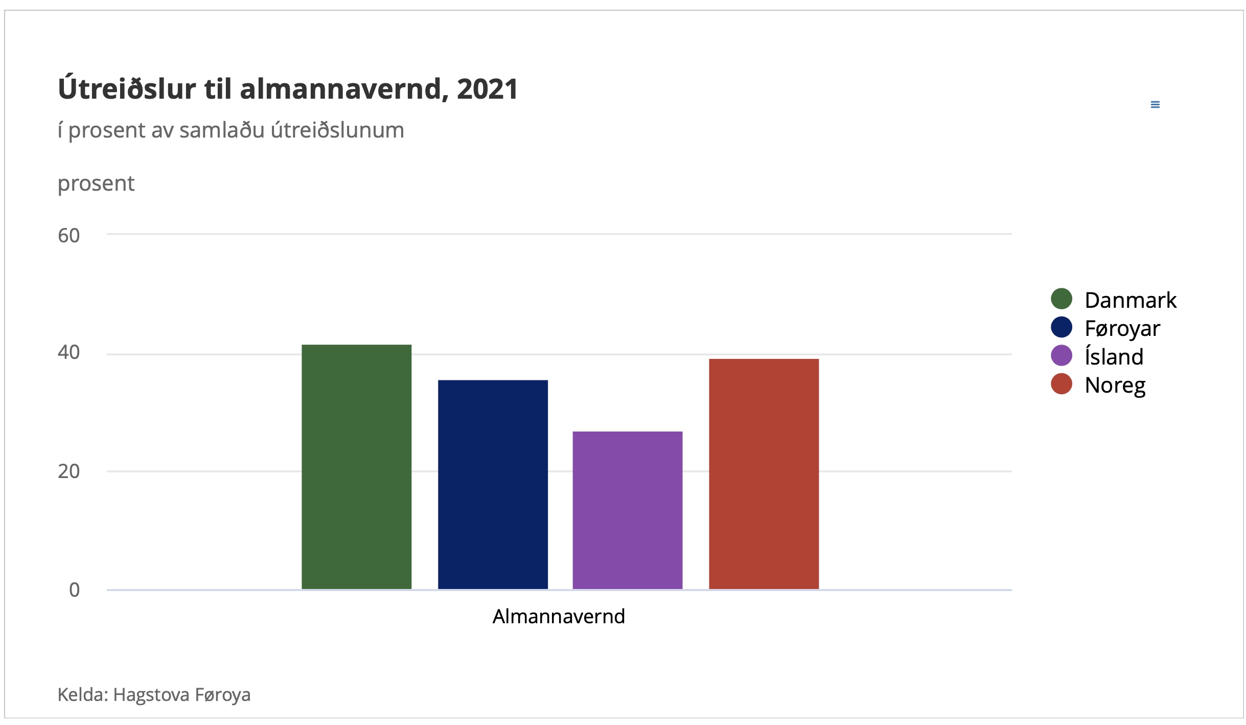 Uppgerðin vísir eisini, at Føroyar brúka ein minni part av útreiðslunum til almannavernd enn tey gera í Danmark og Noregi. Næstan 36 prosent av almennu útreiðslunum í Føroyum fara til almannavernd. Í Danmark og Noregi brúka ávikavist 42 og 39 prosent av útreiðslunum til almannavernd – men íslendingar brúka bara 27 prosent av útreiðslunum til almannavernd.