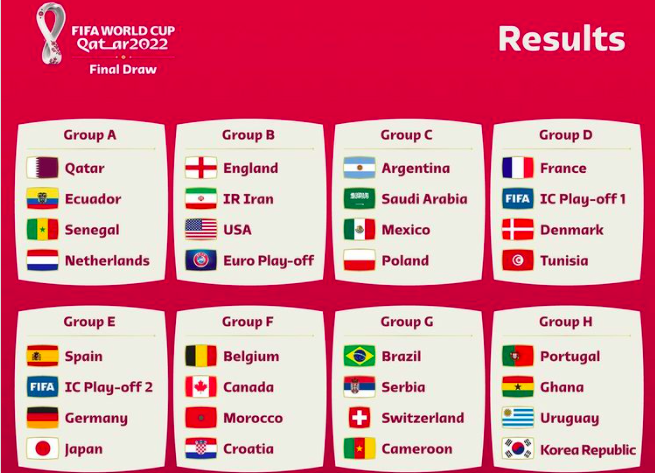 Holland endaði í bólki A, har Katar er styrkismett úr bólki eitt. Tað er klárt veikasta landi í styrkisbólki 1. Ongland og USA eru í bólki saman við Iran, meðan Spania og Týskland er millum stórtjóðirnar, ið eru í sama bólki