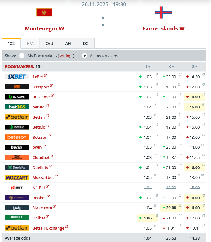 Miðaloddsini upp á montenigrianskan sigur eru so lág sum 1,04.