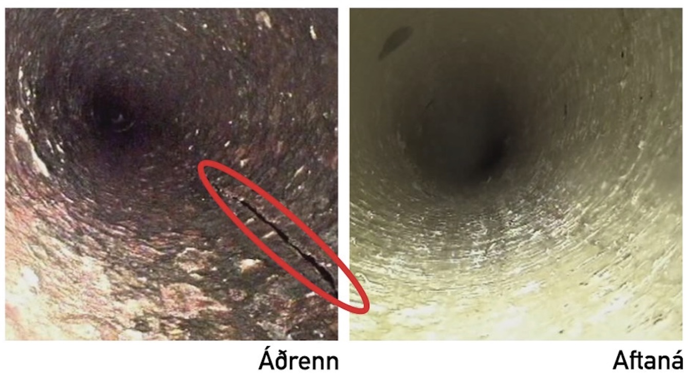 Hosan verður vatntett og blást inn í rørini. Síðani stadnar hosan, og eitt spildurnýtt plastrør er bygt undir jørð.