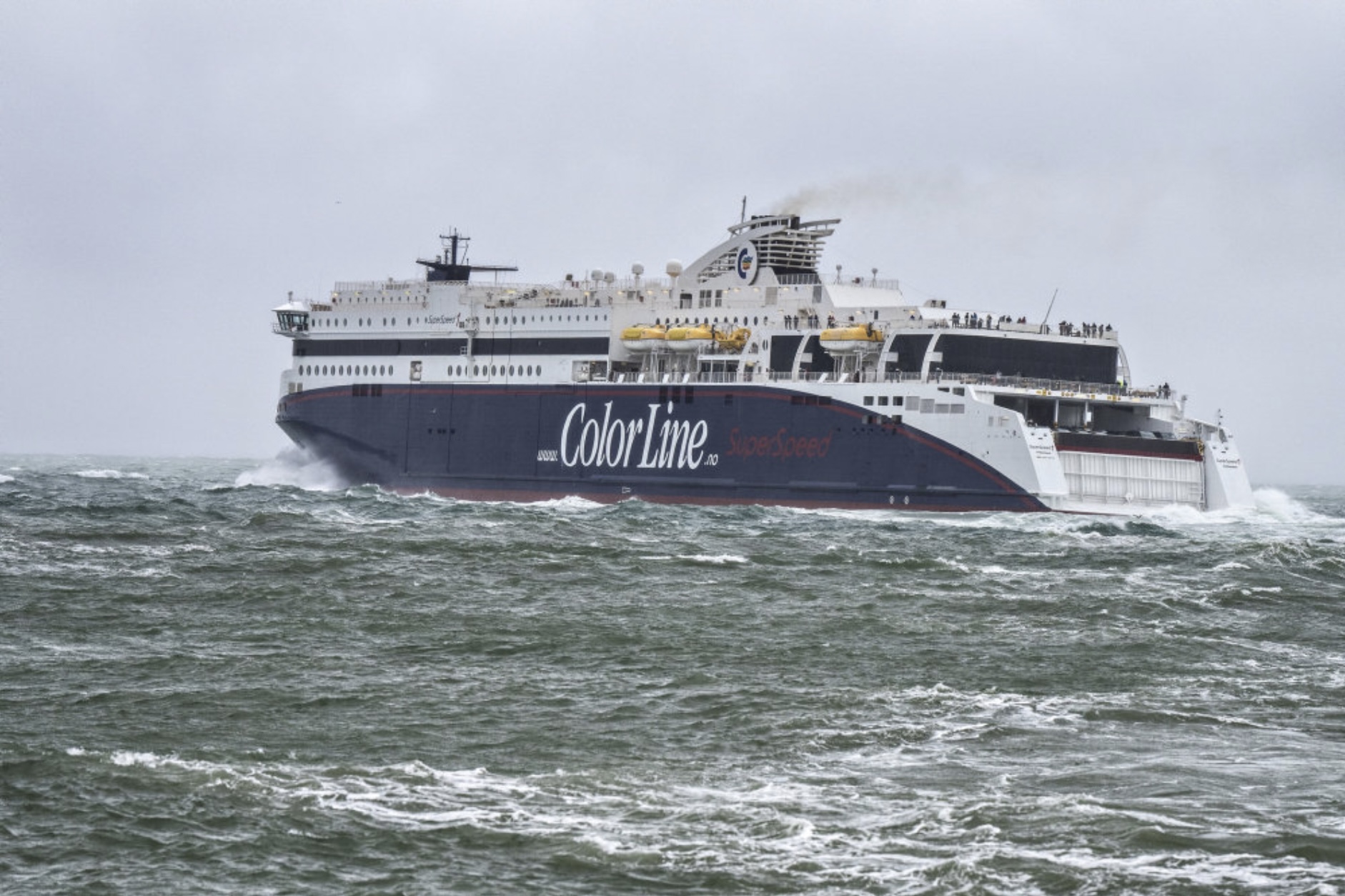 Á heimasíðuni hjá Color Line sæst millum annað, at ferjan, sum skuldi sigla úr Kristiansand til Hirtshals klokkan hálvgum fýra, væntandi ikki fer at sigla fyrr enn klokkan hálvgum átta.