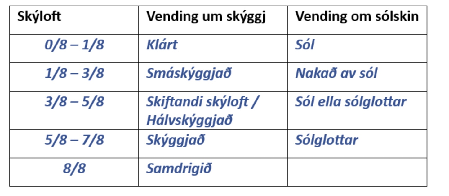 Sól og skýloft: Tá tosað verður um skýloftið og sólini, so er væl lýst hvat ymsu hugtøkini lýsa. Tá ið veðurfrøðingar hyggja eftir mongdini av skýggjum í luftini, so er mannagongdin at man deilur himmalin upp í áttandapørtum, eisini kallað okta á fakmáli. Tá tað er gjørt, so verður mett um, hvussu nógvir áttandapartar eru tildekkaðir av skýggjum.