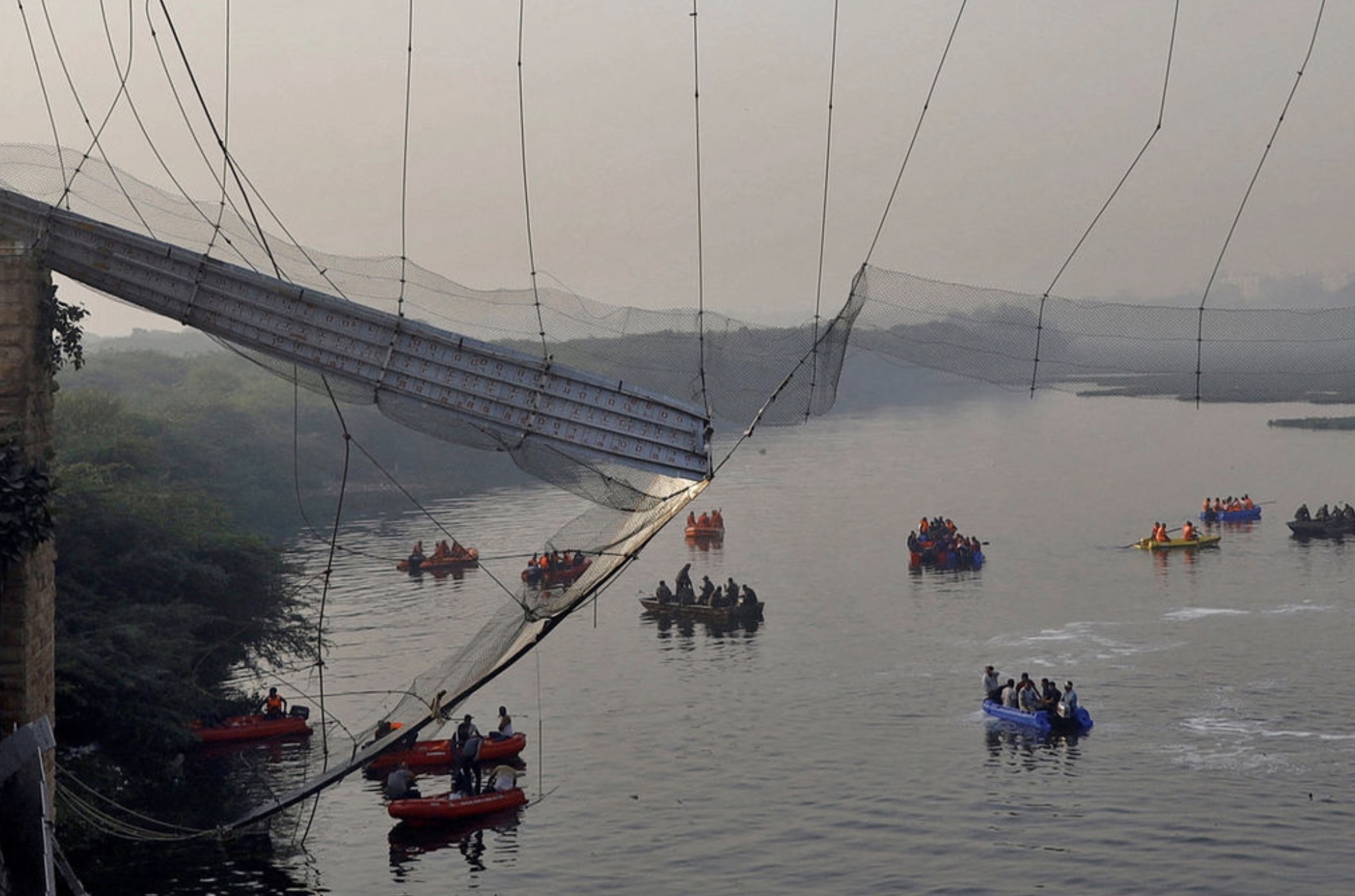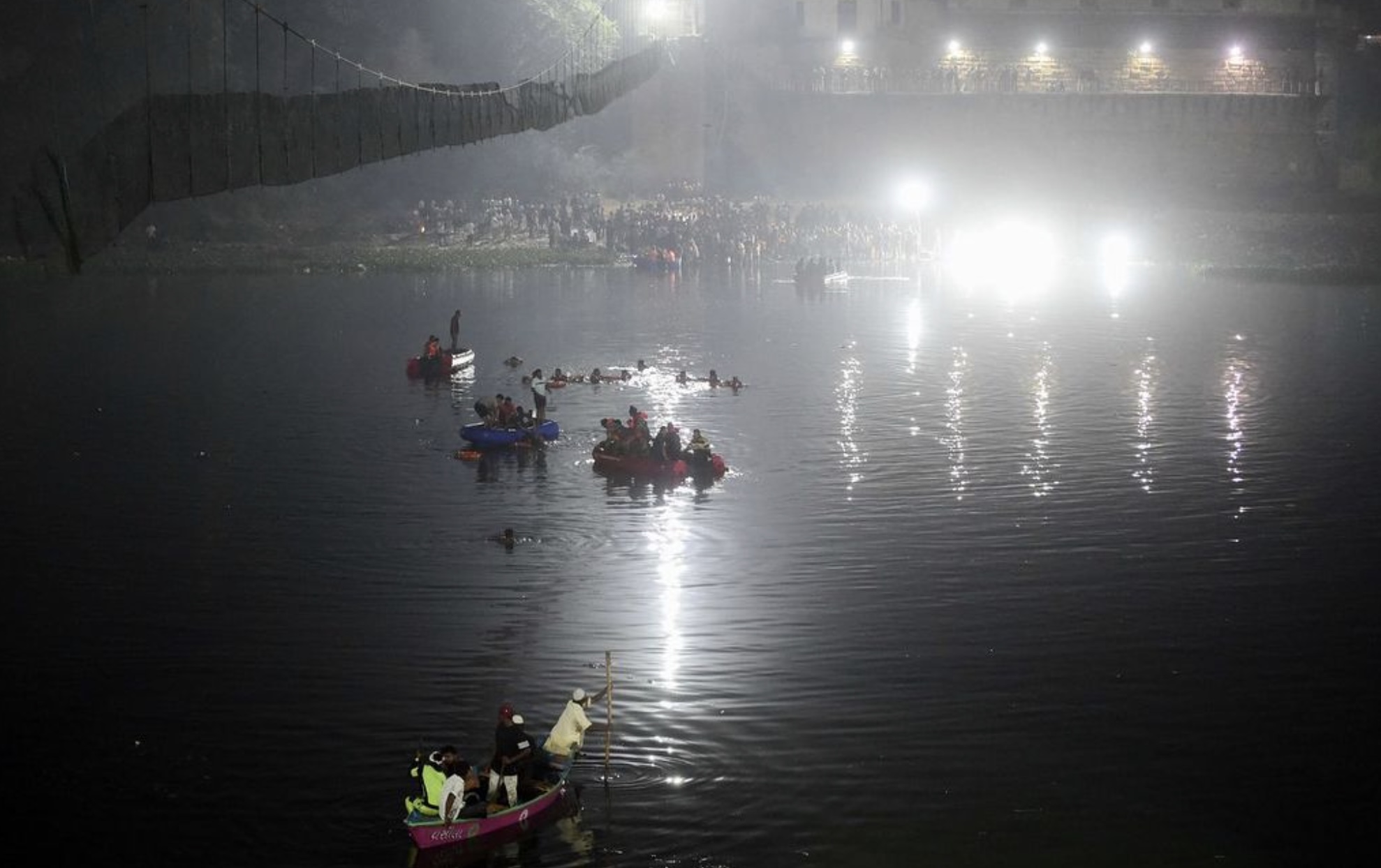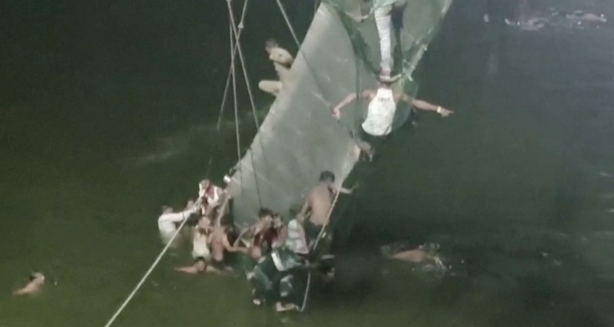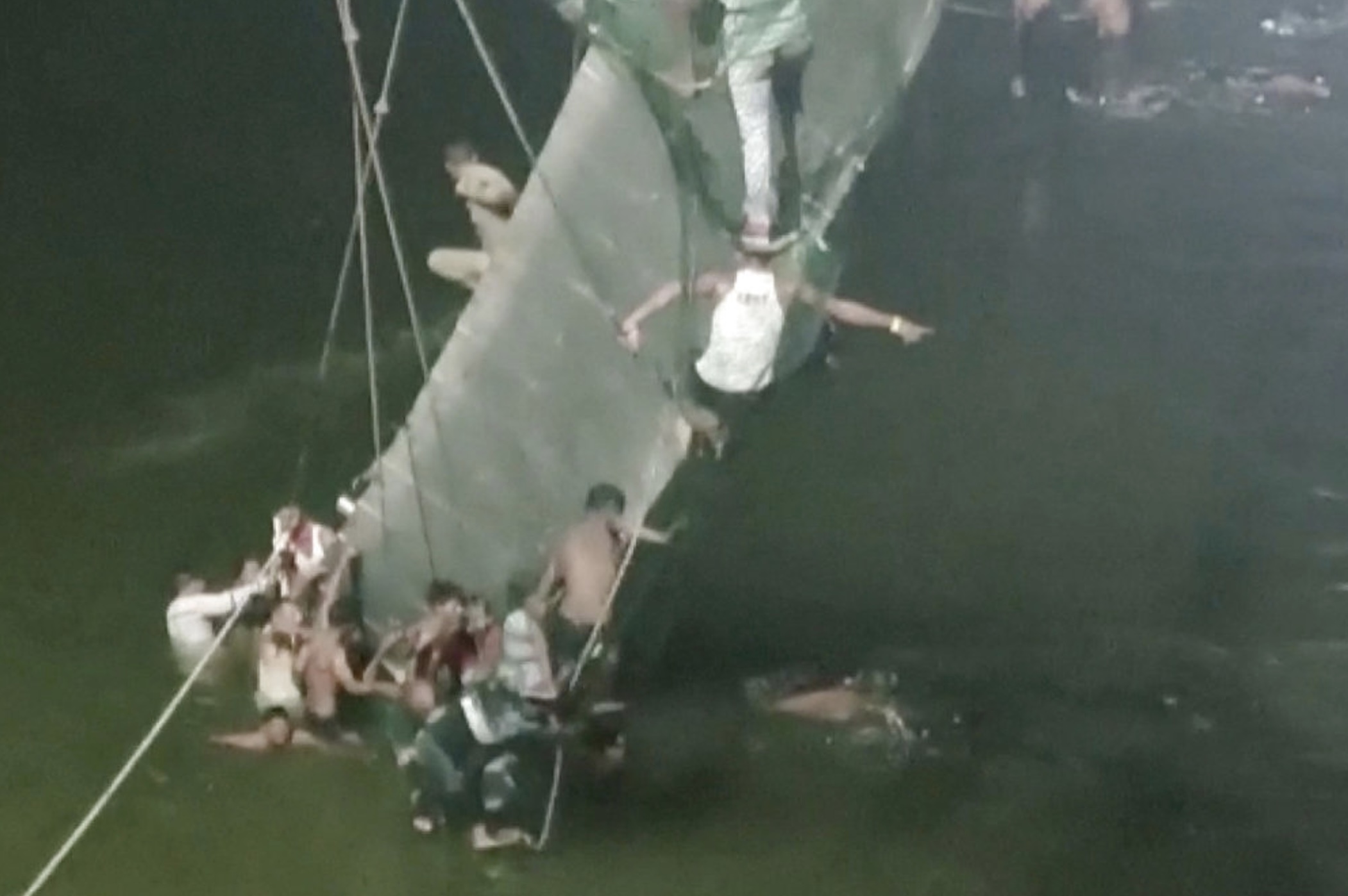 Myndugleikarnir siga, at næstan 500 fólk hátíðarhildu Diwali-hátíðina við og á 150 ára gomlu heingibrúnni í býnum Morbi, tá berandi káplarnir stukku stundur í skýmingini.