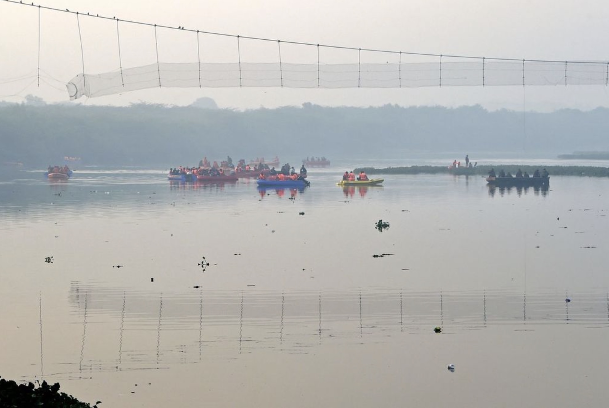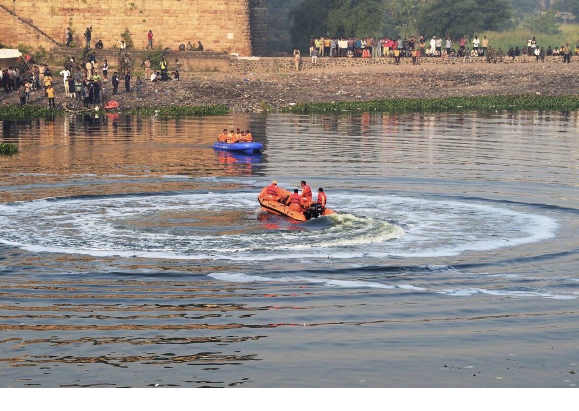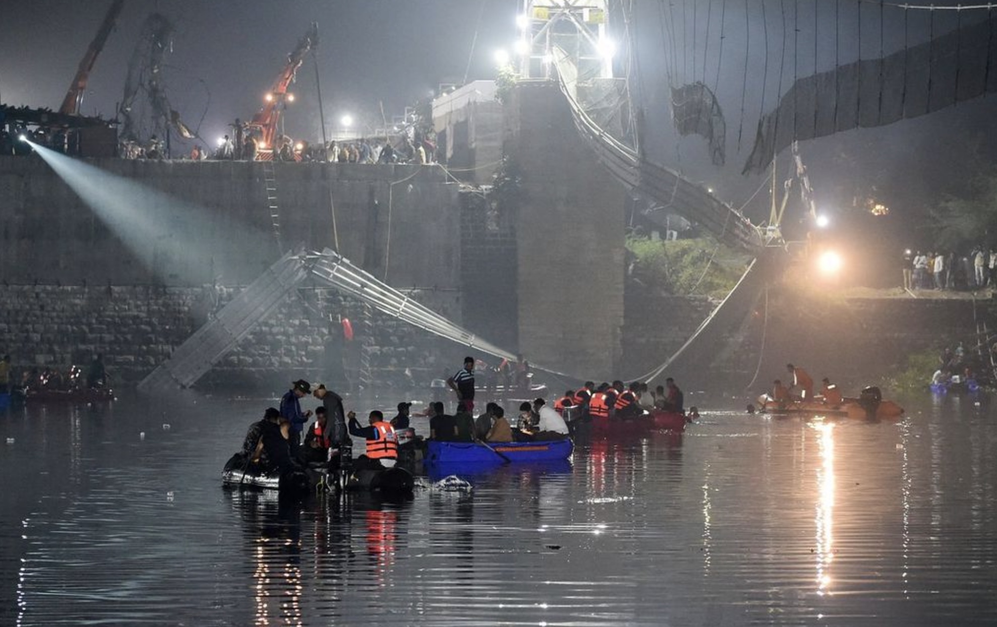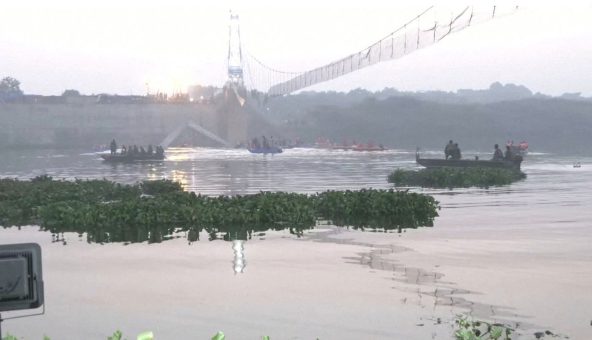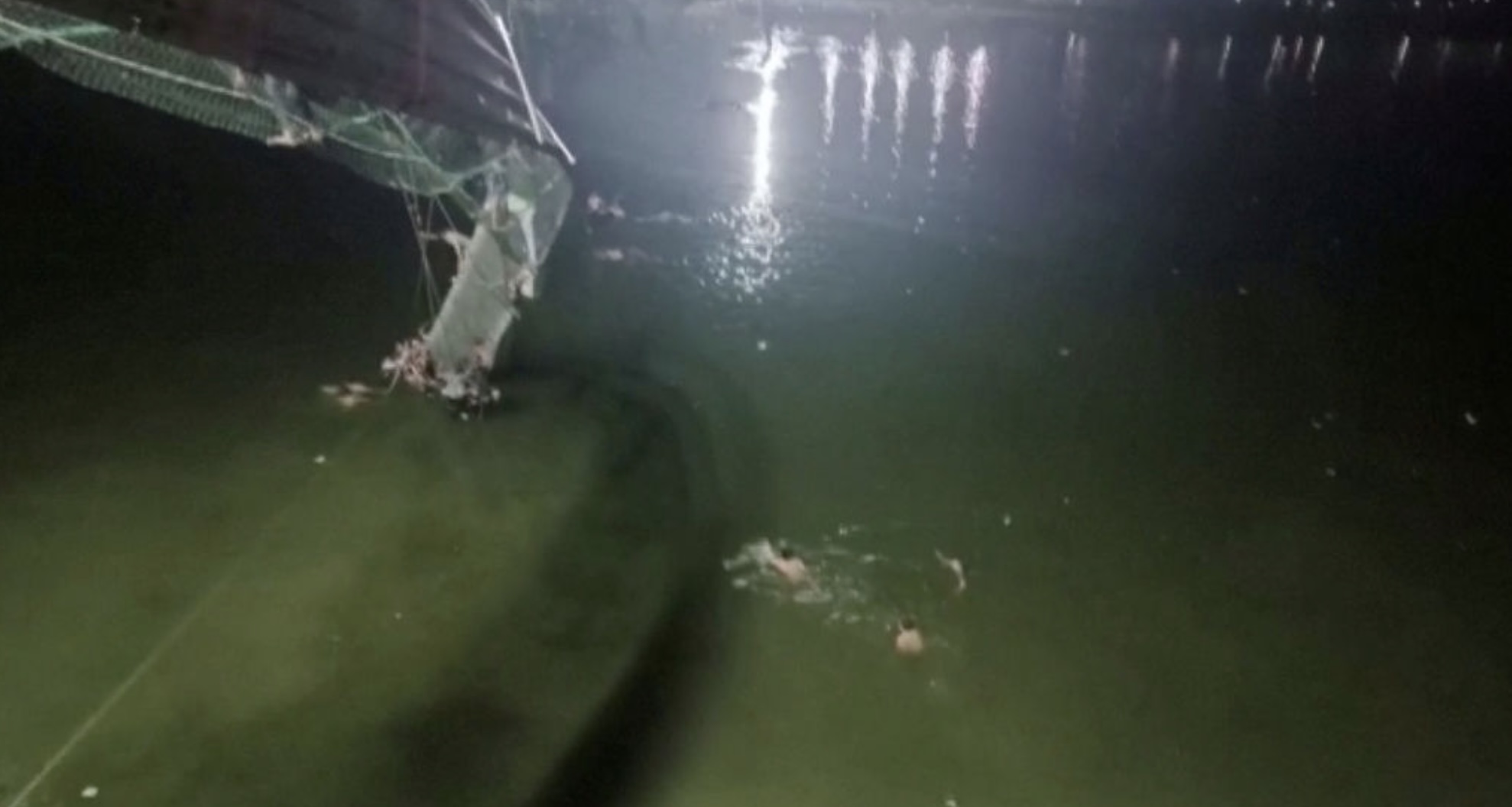 Myndugleikarnir siga, at næstan 500 fólk hátíðarhildu Diwali-hátíðina við og á 150 ára gomlu heingibrúnni í býnum Morbi, tá berandi káplarnir stukku stundur í skýmingini.