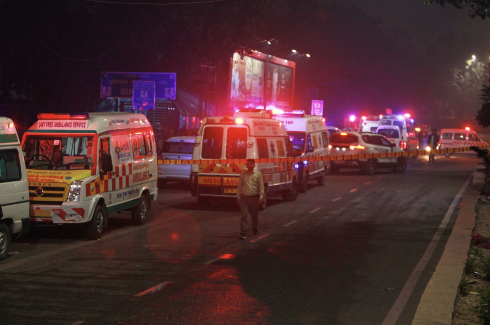 Sambært talsmanninum Sanjay Tyagi frá løgregluni í New Delhi hendi spreingingin í einum bili í økinum. Síðani kom eldur í fleiri onnur akfør.