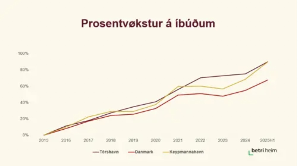 Til samanberingar eru sethúsaprísirnir í Tórshavn øktir við 110% síðan 2015, meðan sethúsaprísirnir í Keypmannahavn og Danmark eru øktir við ávikavist 91% og 47%.
