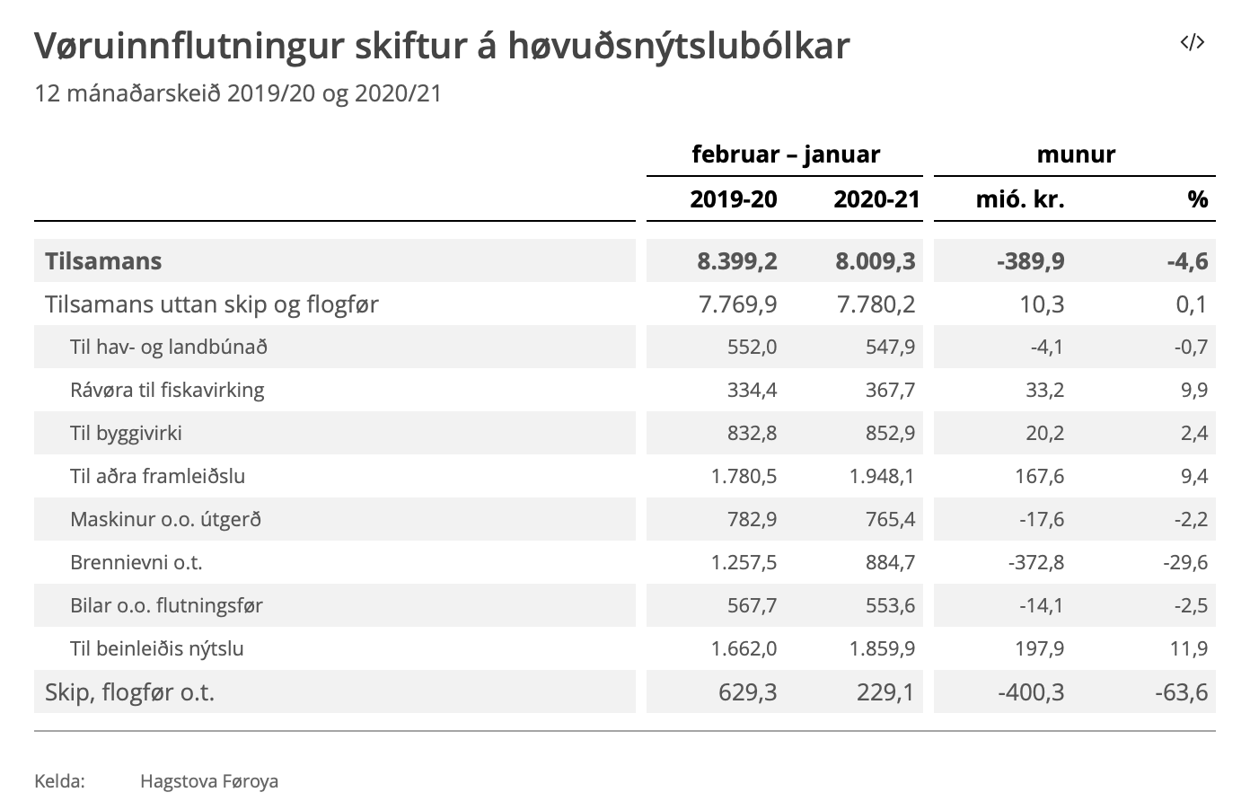 – Innflutningurin av skipum er minkaður 400 mió. kr., og vit hava eisini brúkt útvið 400 mió. kr. minni upp á brennievni, serliga vegna lægri prís á brennievni. Fyri flestu av hinum vørubólkunum er innflutningurin vaksin ella stendur í stað, skrivar Hagstovan.