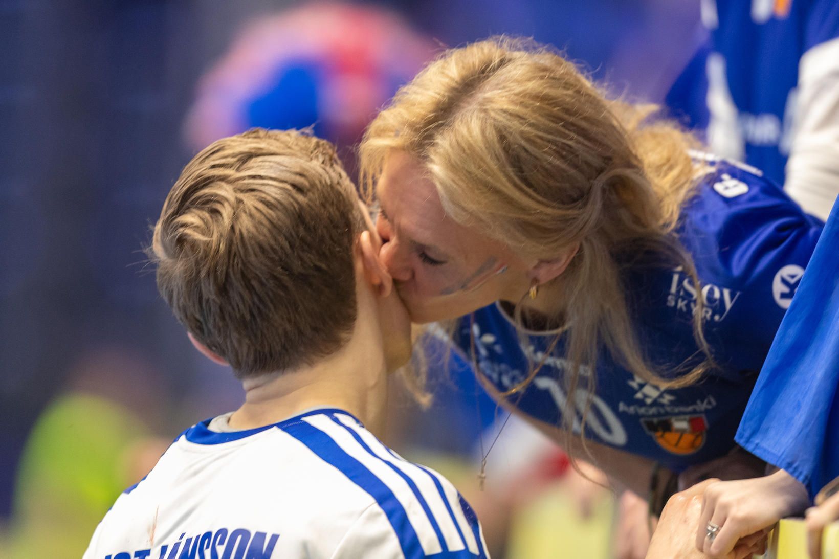Gísli Þorgeir Kristjánsson fekk aftaná dystin ein koss frá stoltu mammuni, ið græt av gleði um bragdið hjá soninum og liðfeløgum hansara.