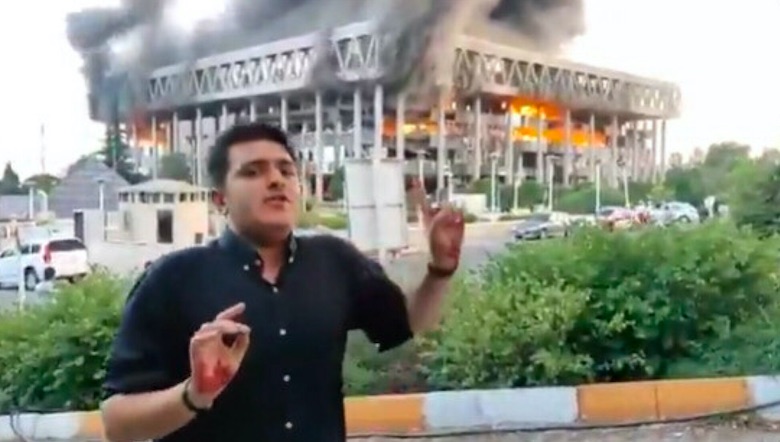 - Eg veit ikki, hvussu nógvir av mínum starvsfeløgum eru deyðir ella særdir, sigur iranski tíðindamaðurin, Junes Shadlou, í beinleiðis sjónvarpi, meðan arbeiðsplássið hjá honum brennur í bakgrundini.