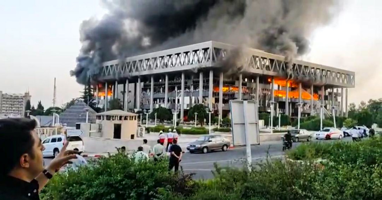 Á livandi myndum sæst tíðindafólk uttanfyri bygningin, og úr bygninginum stendur bæði tjúkkur roykur og eldur, soleiðis sum viðhefta mynd vísir.