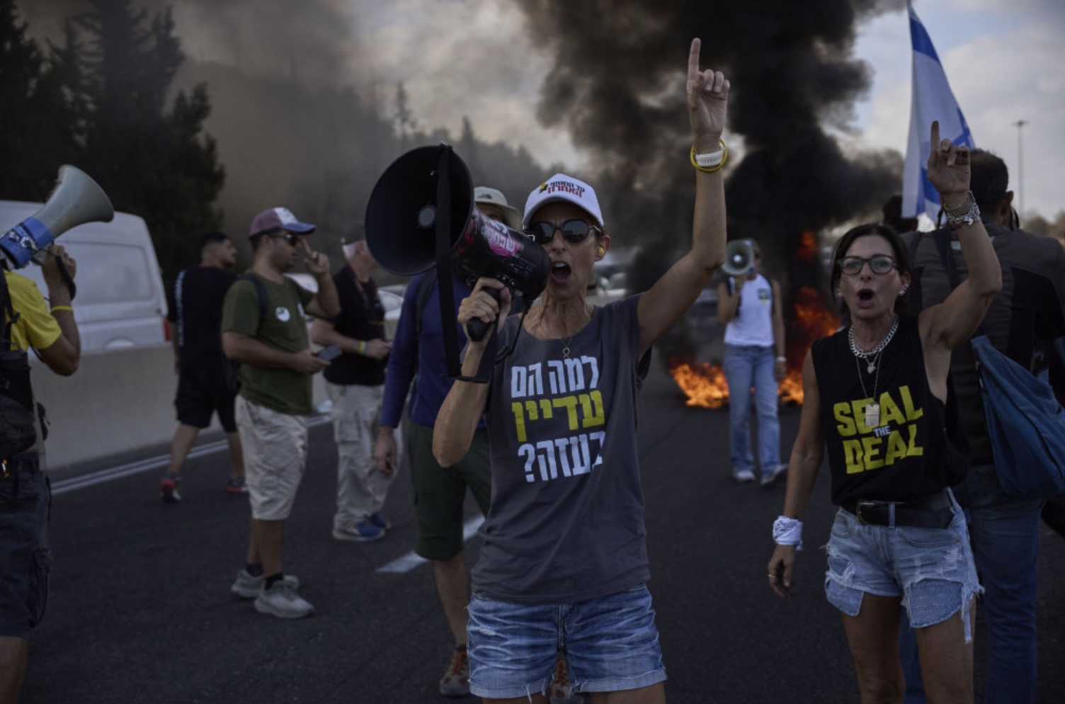 Túsundtals fólk um alt Ísrael hava í dag lagt niður arbeiði fyri at mótmæla í staðin, og kravdu, at Benjamin Netanyahu, forsætisráðharri, skuldi fáa teir seinastu ísraelsku gíslarnar heim úr Gaza og enda kríggið.