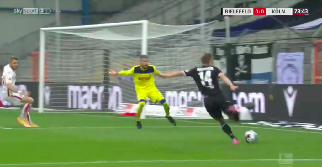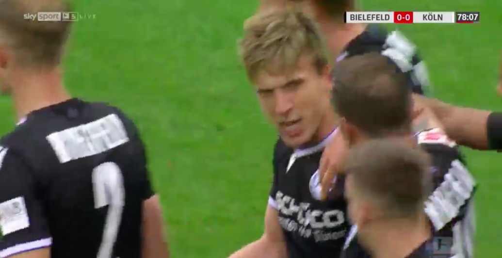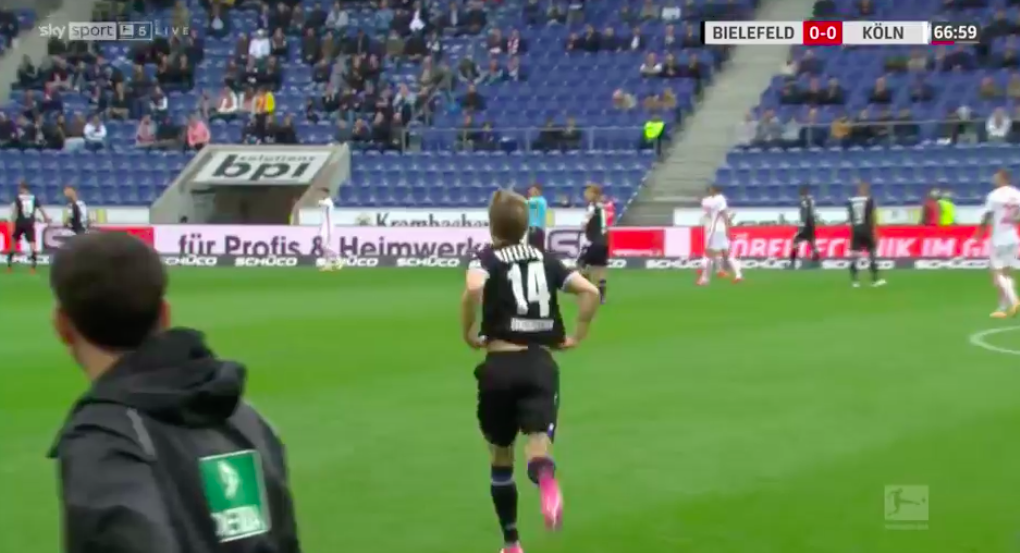 Bara fáar minuttir seinni skoraði hann til 1-0 til Arminia Bielefeld, eftir at hann fekk bóltin í høgru síðani og skoraði úr spískum, eftir at málverjin var komin út.