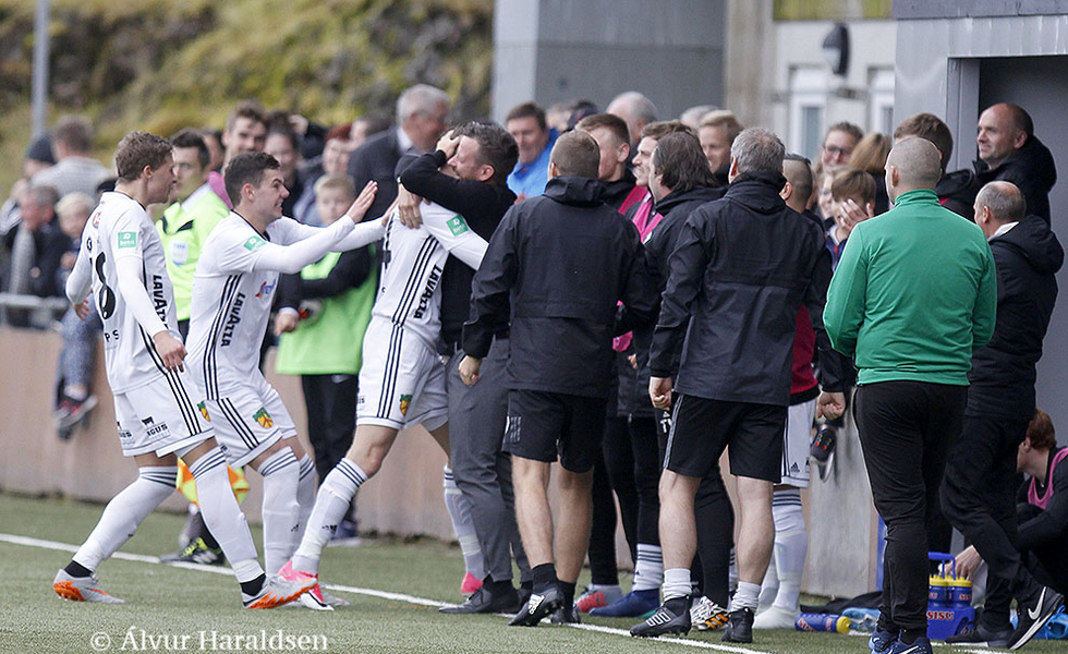 Í gleðini um sigurin og at fáa Brian Jakobsen á máltalvuna aftur er Jákup á Borg alt annað enn fegin um, at Bárður Olsen hjá AB kundi leggja heimaliðið á odda við einum frísparki við einari frástøðu til málið uppá næstan 50 metrar.