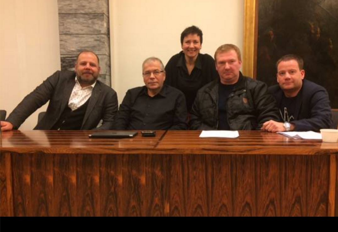 Mynd (Gunvá við Keldu): Fólkafloksmanningin á býráðsfundinum í Klaksvík 12. november 2015: Eyðstein Ó. Poulsen, Erling Petersen, Atli S. Justinussen, Jan Gardar og Gunvá við Keldu.