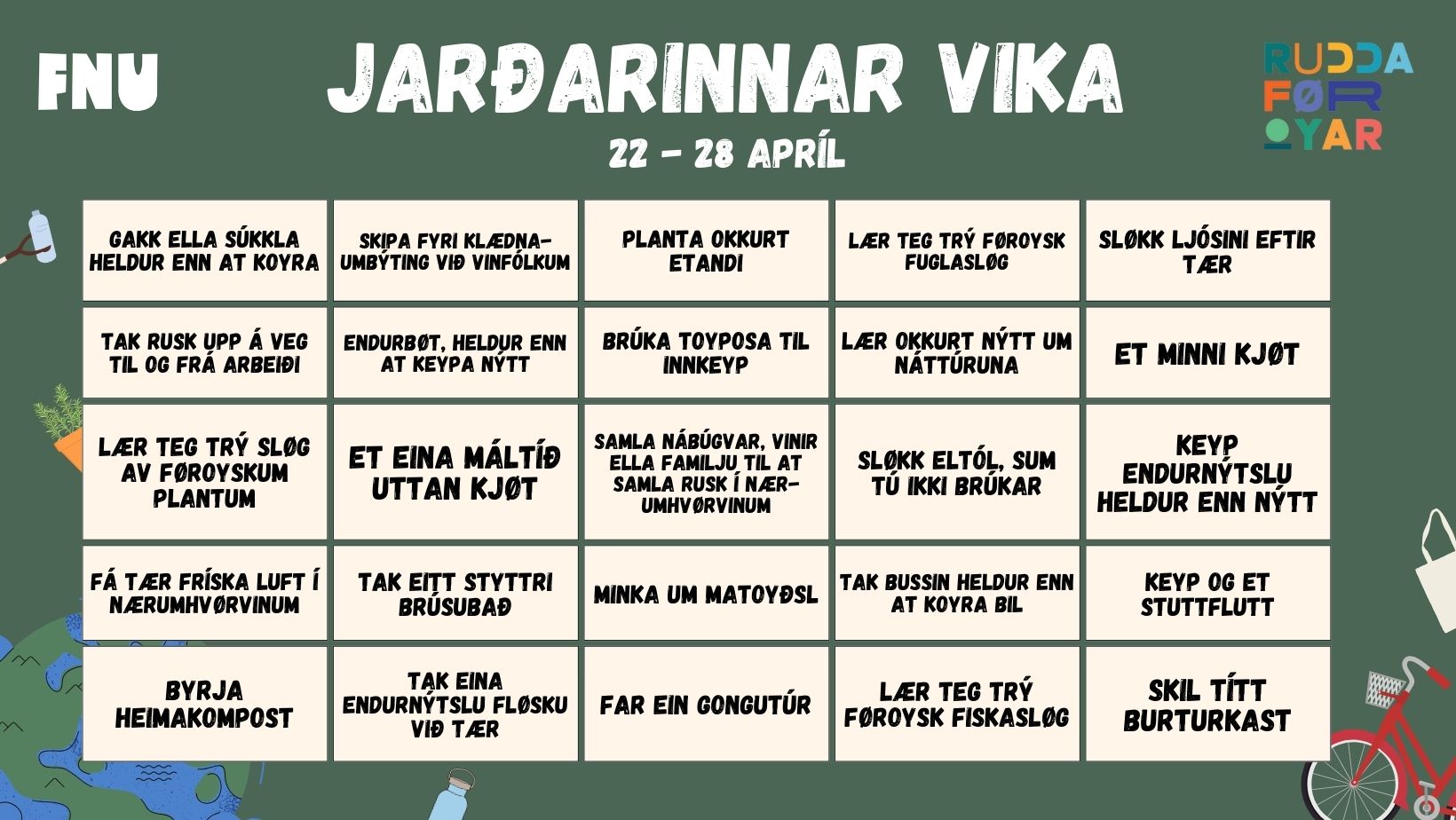 22. apríl er jarðarinnar dagur, og tí skipa Rudda Føroyar og FNU í felag fyri einum stuttligum átaki í døgunum 22.-28. apríl, øll eru boðin við. Felagsskapirnir hava gjørt eina plátu við íblástri til 25 ymisk átøk, sum øll snúgva seg um at læra okkurt nýtt ella gera okkurt, sum gagnar náttúruni. Øll, sum luttaka, eru við í lutakastinum um fýra vinningar.