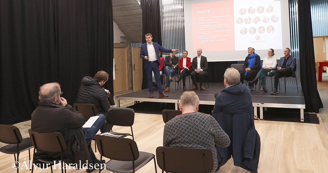 Valskráin hjá Javnaðarflokkinum til fólkatingsvalið hesaferð hevur sjey høvuðspunkt, og tað var ein væl upplagdur formaður floksins, Aksel V. Johannesen, sum stóð fyri sjálvari framløguni.