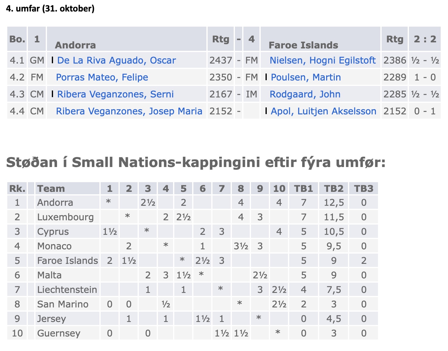 Martin Poulsen hevur ikki havt eydnuna við sær enn. Úrtøkan higartil er eitt remis. Remis er veteranurin John Rødgaaard trygg borgan fyri. Hann hevur telvað javnt í hvørjum dysti higartil. Luitjen tapti í lykladystinum móti Luksemburg, men hevur nú fingið glið á og vunnið alt síðani. Jón í Horni Nielsen hevur bara telvað eitt talv, og tað vann hann.