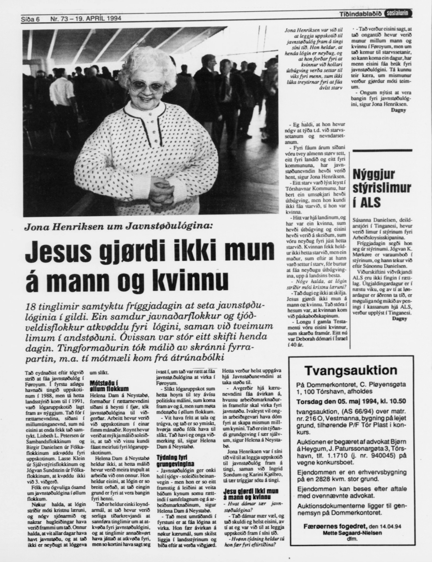 ...Og Ikki fyrr enn seks ár seinni, var løgtingið búgvið til at samtykkja javnstøðulógina. Tað gjørdi Løgtingið tann 15. apríl í 1994 við atkvøðunum hjá øllum samgongutingfólkunum uttan Lassa Klein og hjá andstøðutingfólkunum Birgiri Danielsen úr Fólkaflokkinum og Lisbeth L. Petersen úr Sambandsflokkinum.
