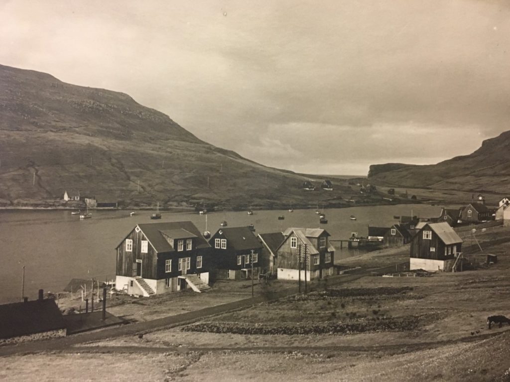 Efter ca 1½ Times Sejlads glider vi ind på Vaagfjorden, hvor “Royndin” ligger smukt pyntet med Flag, seende ind over en festklædt By. Endnu er Kajen i Vaag ikke så langt fremme, at vi kan lægge til den, vi stiger i Land ved en af Broerne, hvor festglade Mennesker modtager os.