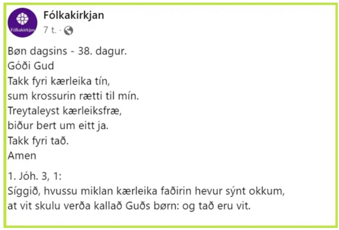 Hevur tú hug at lesa dagligu bønirnar hjá Jógvan Steintún, ber til at fara inn á Facebook-síðuna hjá Fólkakirkjuni. Hesa síðuna finnur tú við trýsta her.